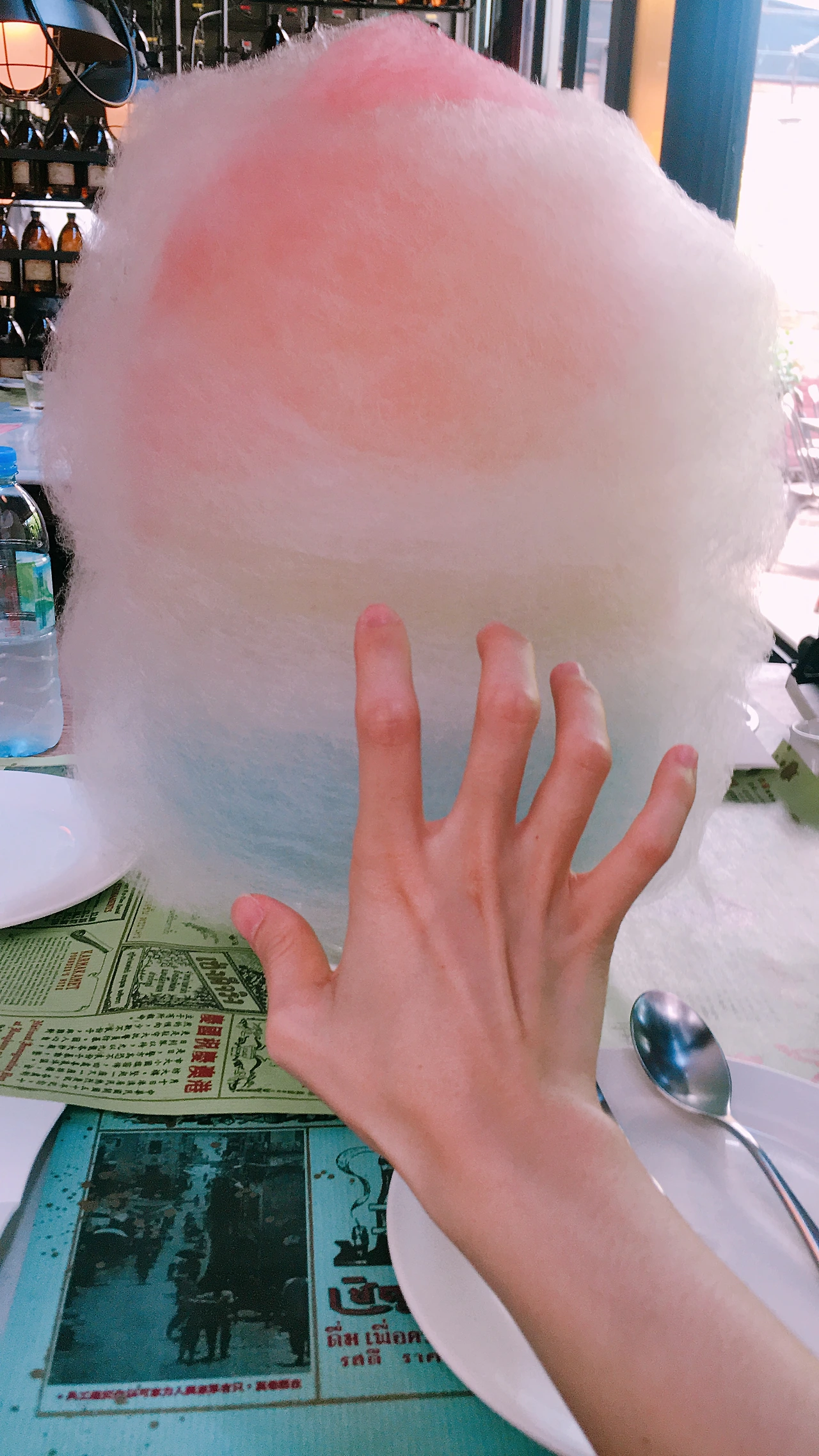 배꼽을 잡고 웃었다. 분명 괴로워하는 엄만데, 엄마는 방금 전에 자신이 먹은 게 믿기지 않아서, 나는 그 모습이 너무 귀여워 보여서 우리는 서로 한참을 되새김질하며 웃었다. 웃은 건 웃은 건데, 방콕까지 와서 팬케이크인 줄 알고 어마어마한 걸 시켜버리다니. 다음으로 서빙된 시그니처 디저트인 무지개색 솜사탕을 북북 뜯어내면서 우리는 얼굴 근육이 당기도록 한껏 웃으면서 영상을 남겼다. 물론 지불해야 했던 웃음의 대가는 의도하지 않게 조금 비싸긴 했지만. 이 정도면 꽤 괜찮은 시작이다.