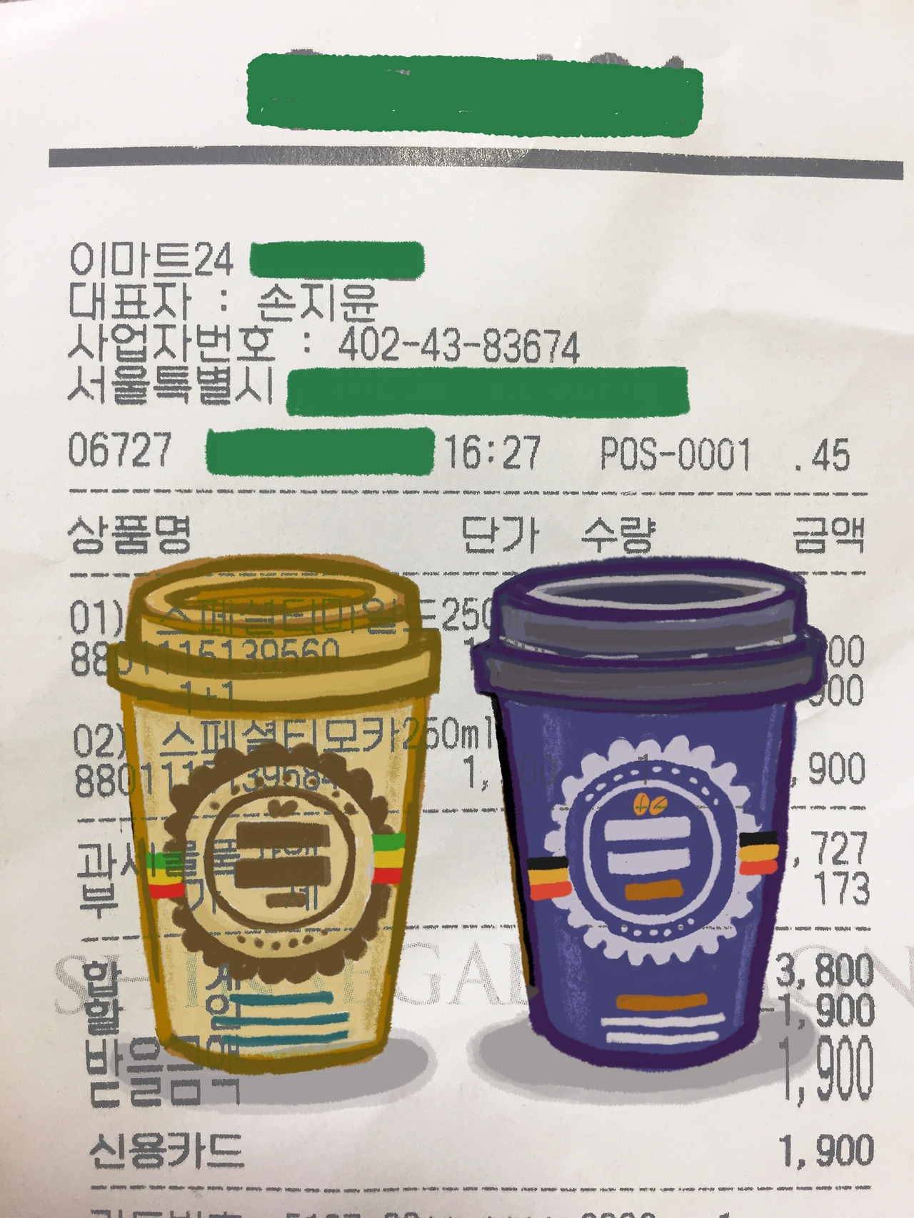 그때 받은 영수증에 구입했던 커피 음료를 그려보았다.