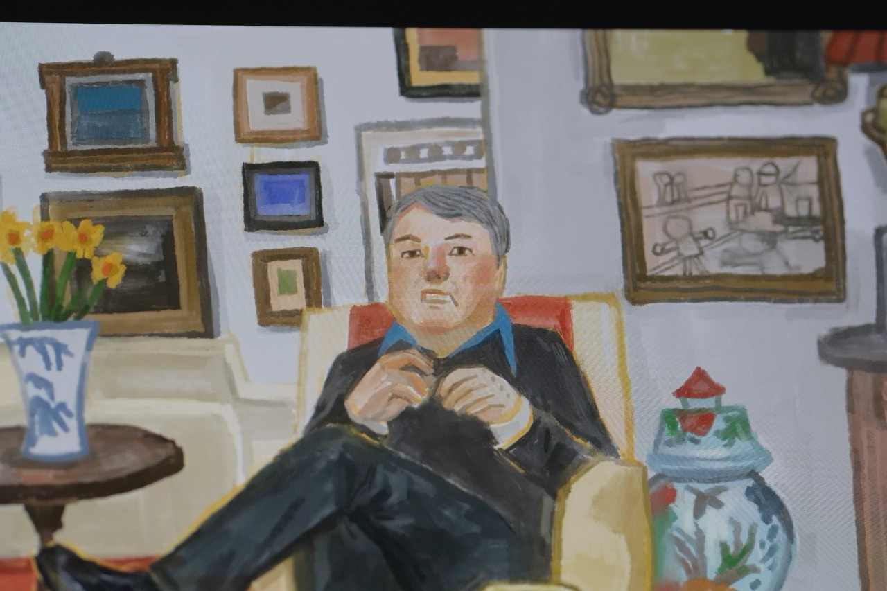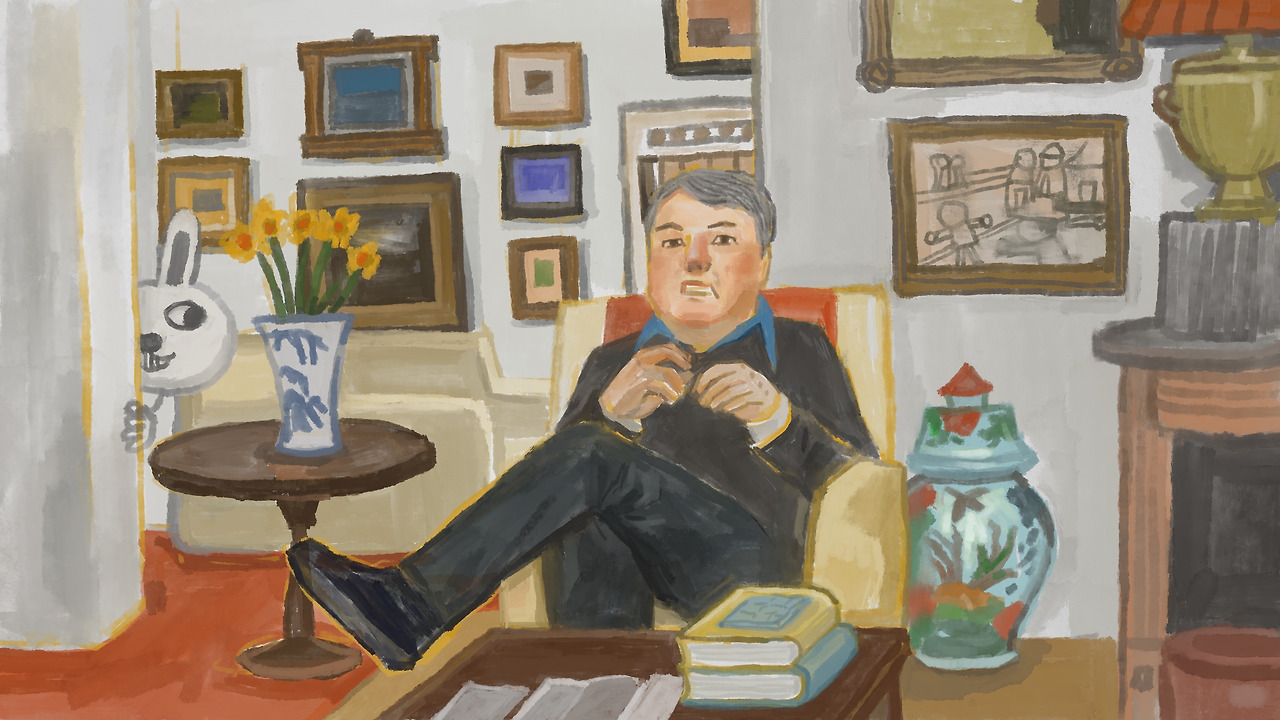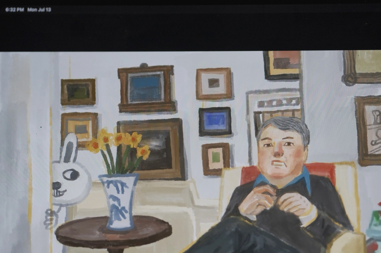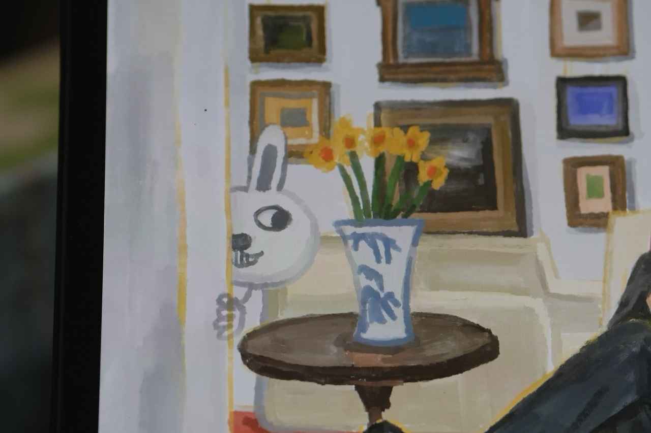 여러 그림들이 벽에 걸린 곳에 앉아있는 남자 그리고 변토(토끼 캐릭터)의 등장