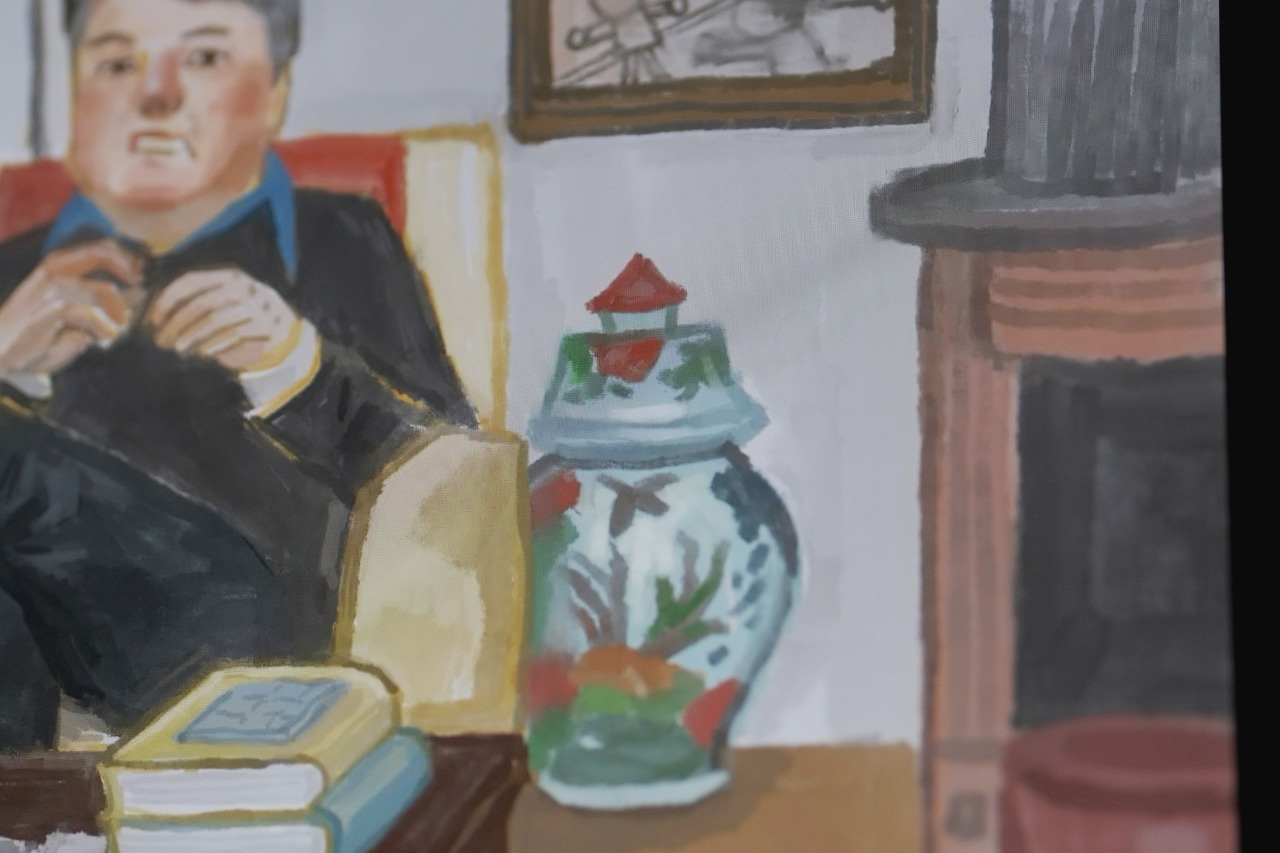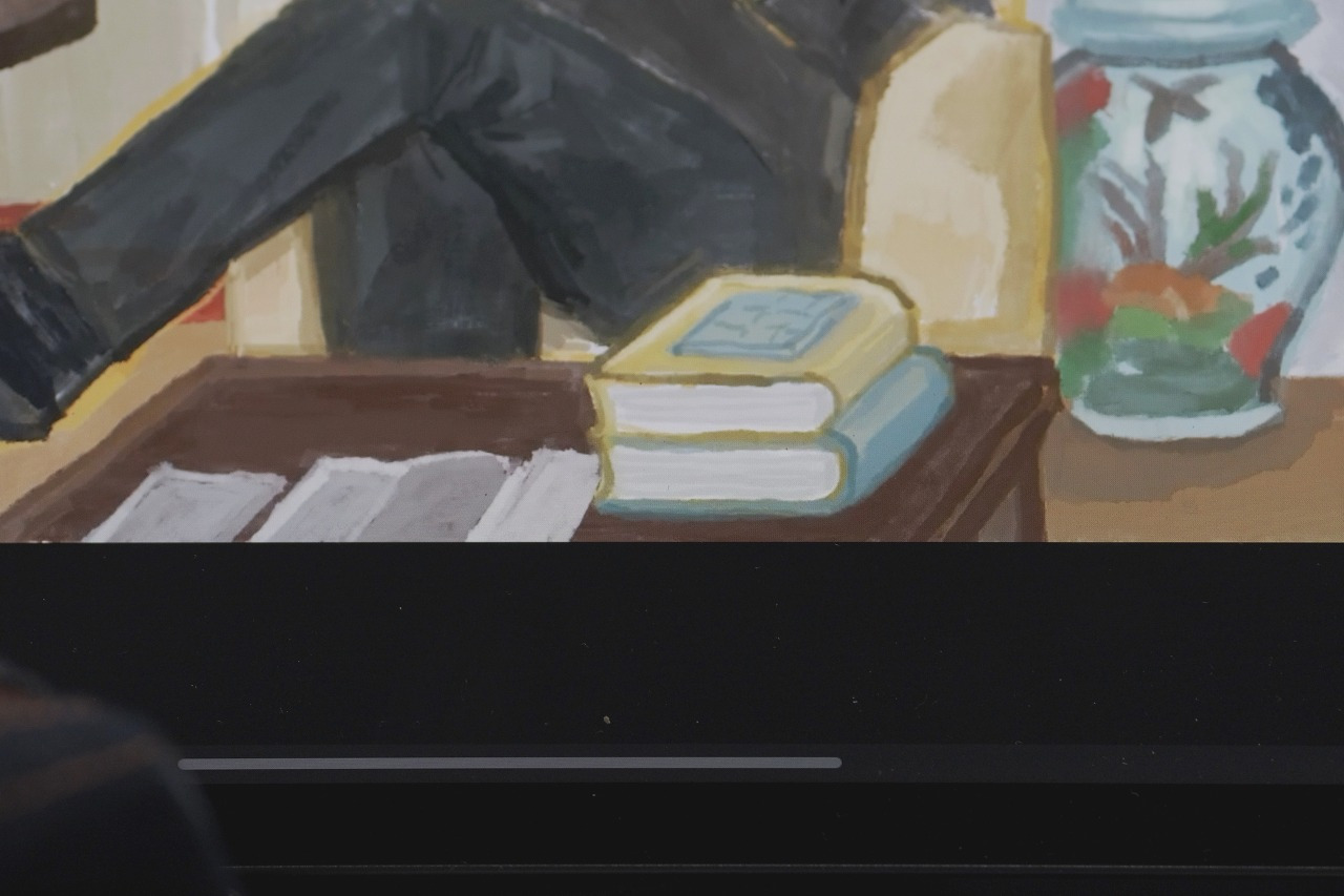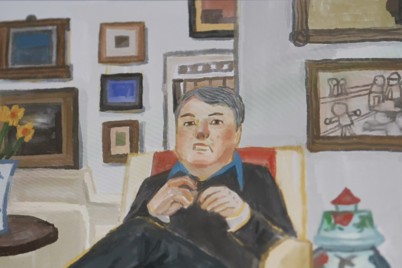 여러 그림들이 벽에 걸린 곳에 앉아있는 남자 그리고 변토(토끼 캐릭터)의 등장
