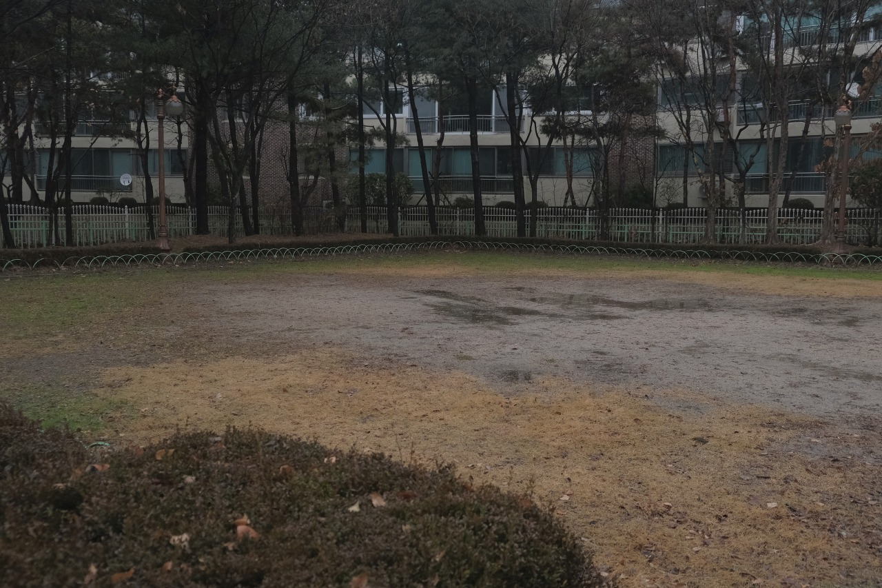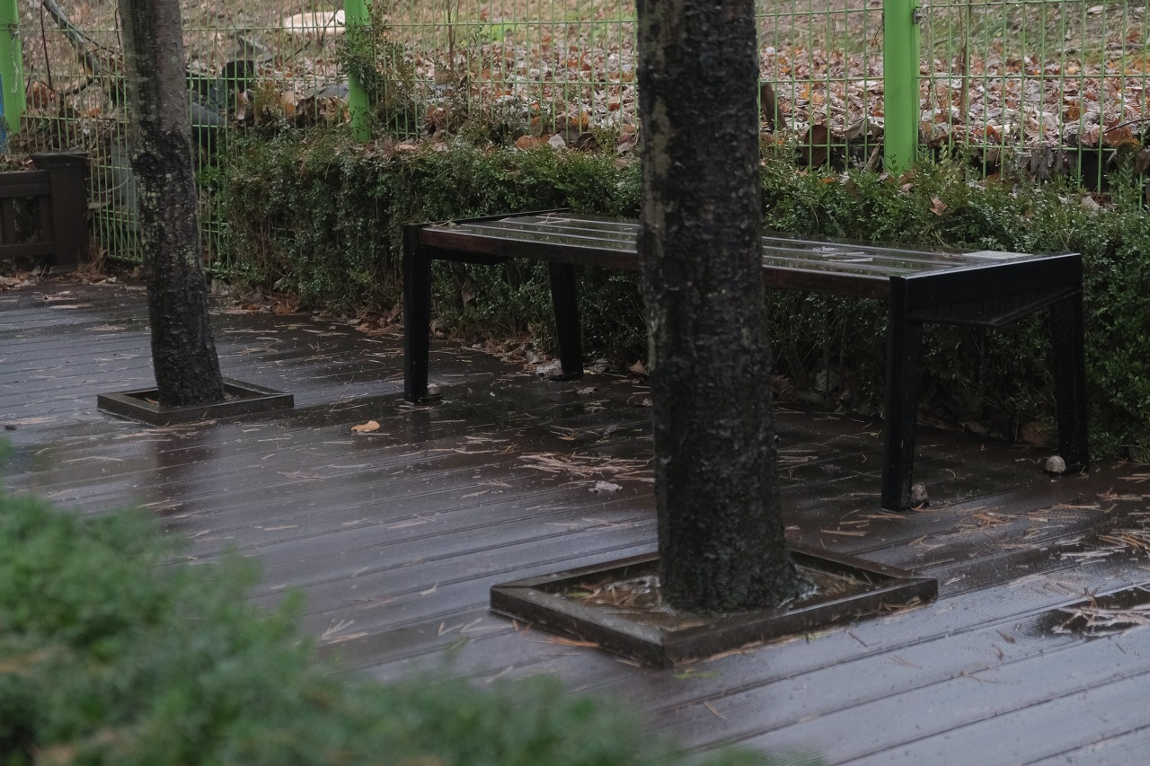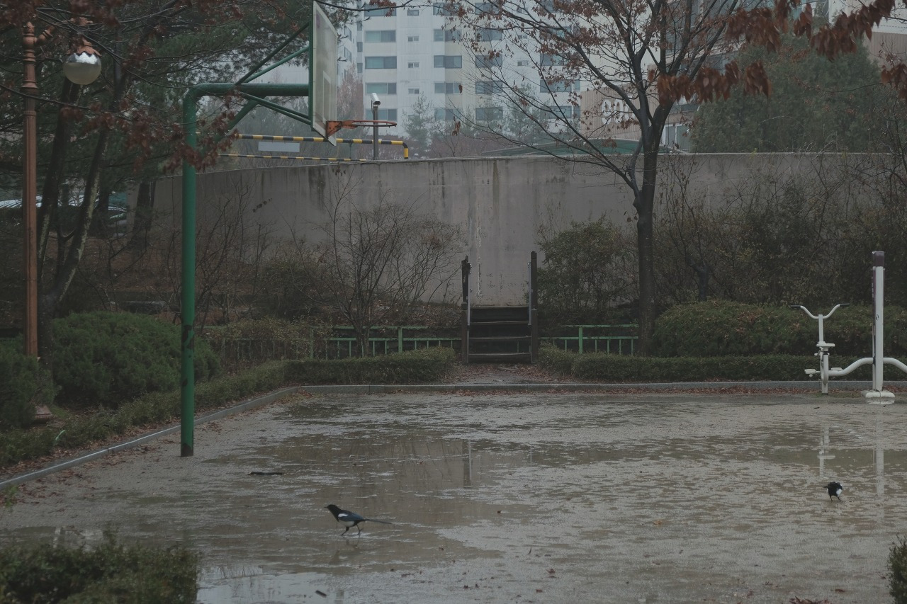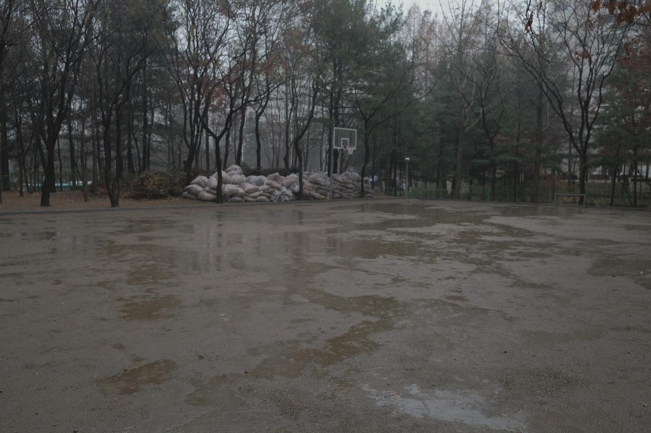 물에 젖은 바닥과 나무들의 색이 달라진다.
