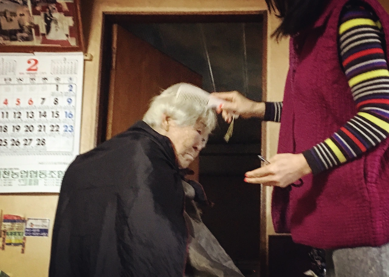 96세 백발의 여자가 미용 가운을 입고 의자에 앉아 있다. 96세 여자의 등 뒤로 57세 여자가 빗과 가위를 들고 96세 여자의 머리를 이리 저리 휘젓고 있다. 33세의 남자가 이불 속에 누워 두 여자가 연출하는 장면을 물끄러미 바라보고 있다. 날은 저물어 밖은 어둑 어둑하고, 방 안에 있는 형광등 조명 하나가 두 여자를 비추고 있다. 설 연휴, 어느 시골집 풍경이다.