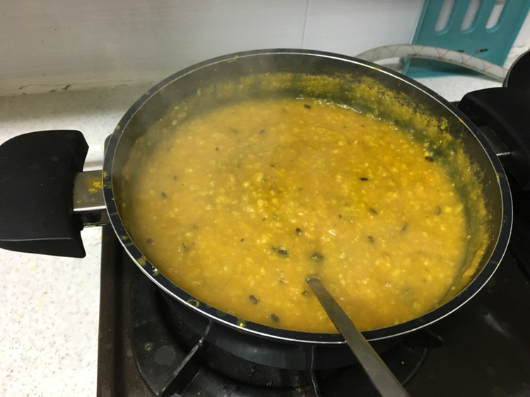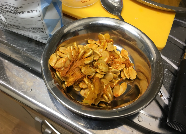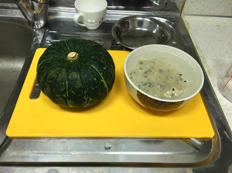 레시피를 찾아 보니 단호박을 믹서기에 갈아야 하나보다. 믹서기는 없지만 왠지 적당한 도구로 꾹 꾹 눌러도 뭉개질 것 같아서 게의치 않았다. 잡곡도 섞기 위해 미리 물에 불려 놓고, 단호박은 전자레인지에 통째로 넣어 5분 동안 돌렸다. 살짝 익은 단호박을 도마 위에 올려 반으로 갈랐다. 씨를 바르고 조각 조각 썰어 냄비에 넣고 물을 부어 끓였다. 그 동안 불려 놓은 잡곡을 숟가락 뒷면으로 꾹꾹 눌러 으깨고, 끓고 있는 냄비에 같이 넣어줬다.