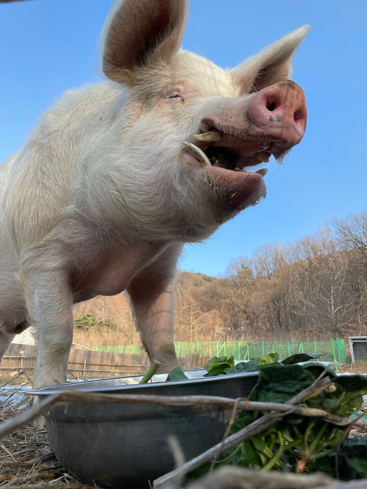 잔디의 ‘꾸우 꾸우’를 듣고 새벽이의 ‘걸걸걸’을 들으니 같은 돼지이지만 전혀 다른 소리처럼 느껴졌다. 울타리 입구에서 실제로 마주한 새벽이의 첫인상은 강렬했다. 새벽이는 처음 보는 사람을 굉장히 경계하고(특히 남성을!) 체격이 잔디의 몇 배나 되기 때문에 조심해야 한다는 사실을 사전 교육 때 들어서 알고 있었다. 그럼에도 실제로 마주했을 땐 훨씬 더 압도적이었다. 새벽이 입 양 옆으로 길게 자란 날카로운 엄니는 보기만 해도 위압적이었다. 또 하필 그날 돌봄을 함께 한 활동가 L의 팔에 심상찮은 대형 반창코가 붙어 있어서 나는 설마 하는 마음으로 물어보았다.