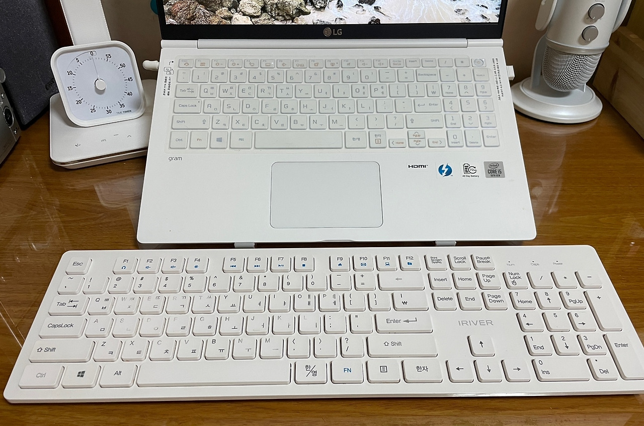 어쨌든 나름 잘 쓰고 다녔는데 이 노트북의 단점이 키판의 열이 어마무시하다는 거였다. 이전에 썼던 노트북들은 무거운 대신 (덕분에 6개월 들고 다니다가 손목 인대 늘어나서 치료 받음) 두꺼웠던 터라 노트북을 장시간 사용해도 손가락 뜨거운 줄 몰랐는데, 키판이 얇아진 만큼 1시간 정도만 써도 손가락이 따끔따끔 했다. 맨 처음에는 내 몸의 문제인가 싶었는데 나중에 노트북 문제인 걸 알고 AS센터에도 찾아갔는데 어쩔 수 없는 부분이라고 해서 냉각팬 돌아가는 노트북 전용 접이식 책상도 사고 별 짓 다 했는데, 결국 선택한 건 키보드 연결해서 쓰자는 것이었다. 바깥에서 쓸 때에는 어쩔 수 없지만 집에서 쓸 때만이라도 뜨겁지 않게 쓰고 싶었다. 그렇게 나는 유선 키보드를 연결함으로써 손가락 뜨거움에서 해방되었다.