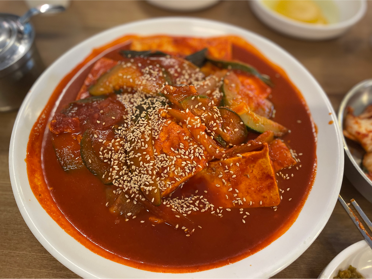 '동원 칼국수' 근처에 도착해서 골목을 주차를 하기위해 몇번 돌다가 다행히 식당 근처 길에 자리가 나서 주차했다. 식당을 향해 걸어가면서 당시 ‘여기 참 복잡하다’ 라고 생각했던 기억 등등이 되살아났다. 던킨 도너츠로 기억되는 곳은 파스쿠찌로 바뀌어 있었다. 그리고 식당이 예전엔 신발을 벗고 들어가야 하는 좌식이었는데, 들어가보니 다행히 테이블과 의자가 생겨서 좋았다. 아이는 식당을 한참 둘러 보더니, "여기 예전에 신발 벗고 앉아서 먹었지?" 라고 한다. 기억이 전혀 안난다고 했는데, 그 공간속에 들어와 보니 그제야 어렴풋이 기억 나는 듯 했다. 마침(?) 어떤 아이가 계속 떼를 쓰며 울고 있는 소리가 들려서 아이들이 어릴 때 기억이 저절로 소환 되었다. ㅋㅋ 일단 식당에 들어 오니, 다시 언제 올까 싶기도 하고, 마음이 흥분되어 모든 메뉴를 다 시키고 싶었지만, 칼국수와 두부 두루치기, 면사리를 주문했다. (다 먹을 수 있을 것 같았는데, 이것도 많이 남았고, 그렇게 남겼는데도 다음날 몸무게가 1kg 늘어 있었다. ㅜㅜ) 맛있어서 많이 먹었다기 보다는 다시 올 수 없을 것 같아서 먹을 수 있을데까지 먹었다고 하는게 맞을 것 같다. 물론 맛도 있었지만, 평소의 내 섭취량을 훨씬 초과하는 양을 먹은 이유는 추억을 되새기고 그때도 지금도 계속 기억하고 싶었던게 컸던 것이다.