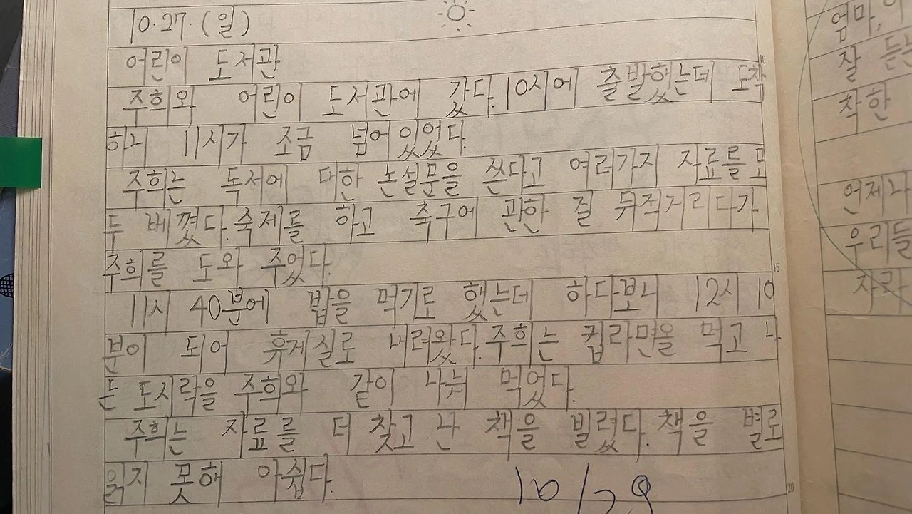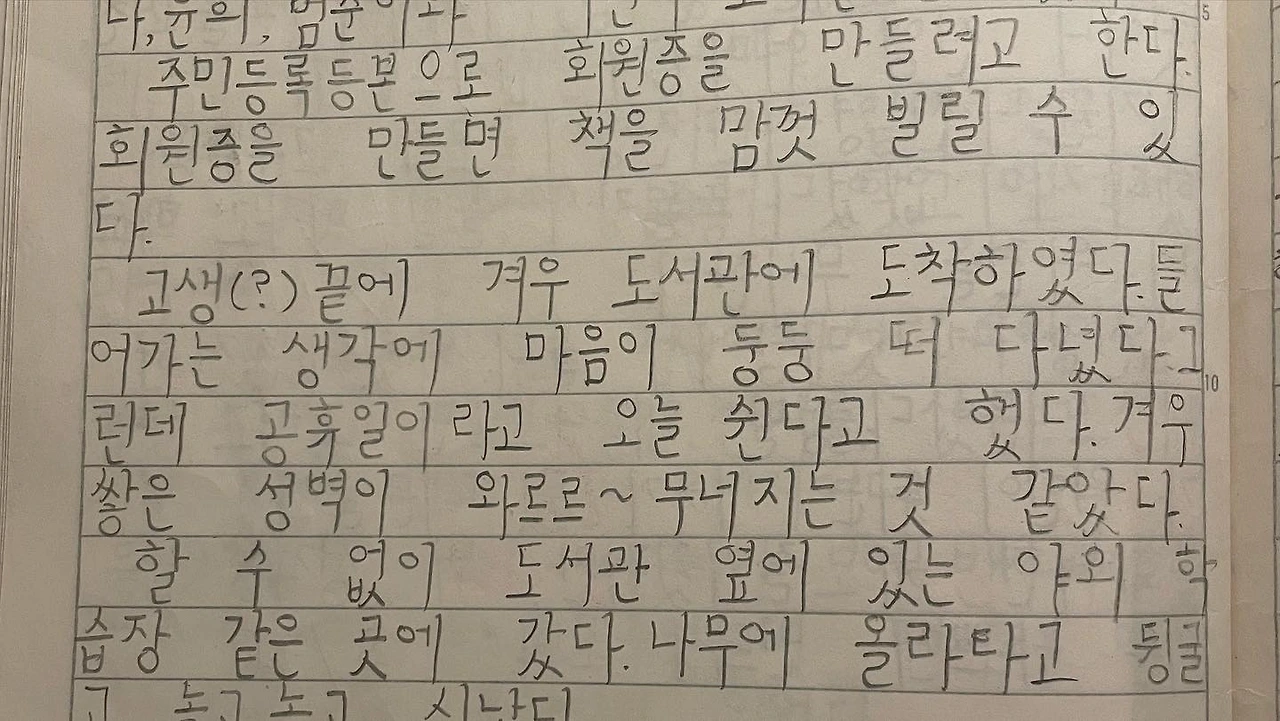 오랜만에 그 시절(초등학교 4-5학년 때) 일기를 꺼내보니, 다행히 도서관이나 과학관에서 컵라면을 먹었다는 기록이 많아서 내 기억이 틀린게 아님을 확인할 수 있었다. 컵라면을 먹은 횟수는 집에서가 훨씬 많을 텐데도, 음식은 음식 그 자체, 함께 먹는 사람을 넘어 먹는 장소가 주는 의미도 큰가 보다. 또한 오랜만에 컵라면을 먹지 않았다면, 이 옛기억이 떠오르지도 않았을 것 같다. 정말 컵라면 향기는 추억을 실어왔다. 도서관에서는 명랑 소설류를 읽고(일기장에 보면 이런 책을 읽는 것에 대해 반성을 많이 한다. ㅋㅋ), 과학관이나 박물관에서는 놀기만 하던 어린이었지만, 그 공간을 마음껏 누렸던 기억만으로도 나의 어린 시절은 가난해도 가난하지 않은, 무언가에 대한 사랑으로 가득했던 것 같다. 그리고 어린이 보행자로서 서울의 도심 한복판을 걷고 헤매면서, 지금은 대부분 사라진 그 시절의 공간들에 대한 감각을 내 몸 구석구석에 새겨두어서 정말 다행이라는 생각이 든다.
