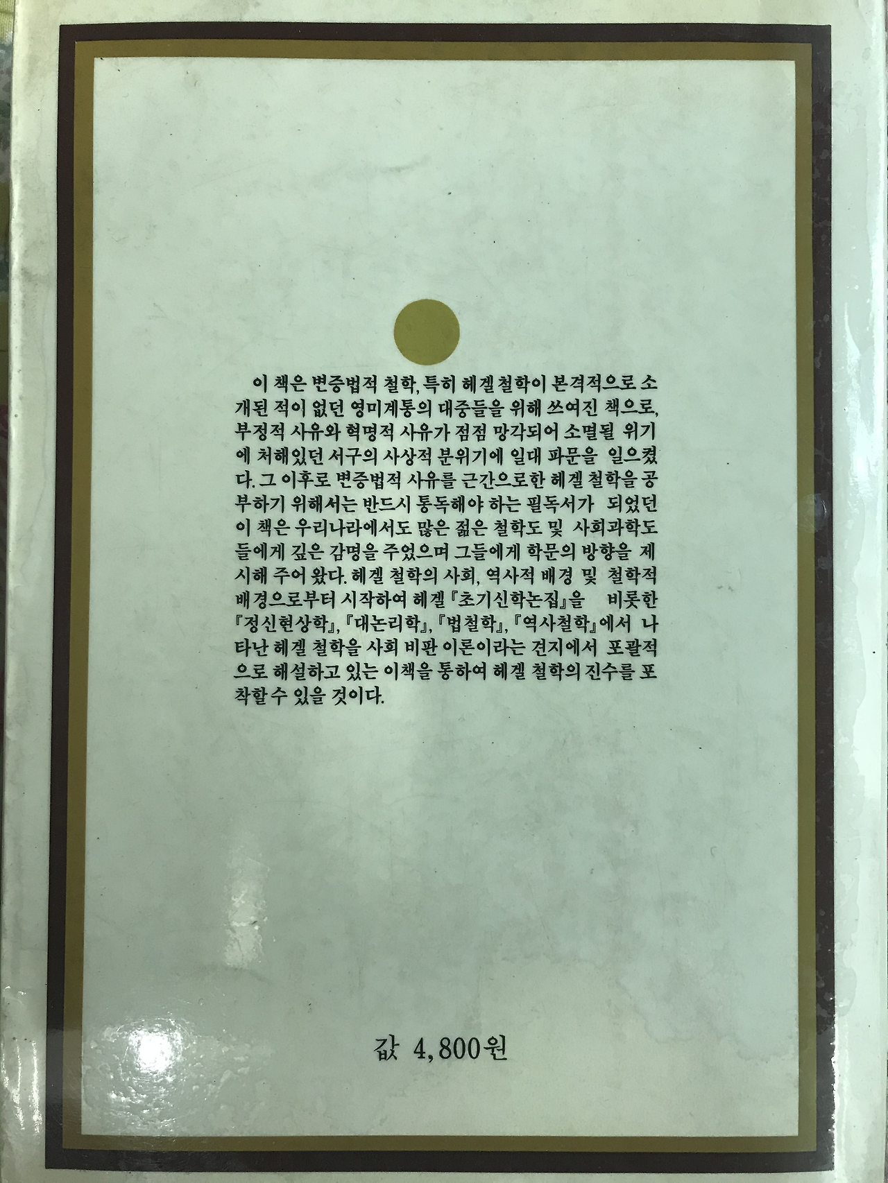 "이 책은 헤겔 철학의 부활보다는 오늘날... 망각되어 소멸할 위험에 처해 있는 하나의 정신기능, 즉 '부정적 사유능력'의 부활에 작으나마 공헌을 했으면 하는 바램에서 쓰여졌다... 세계는 그 자체 모순적인 세계... 상식과 과학은 이러한 모순을 스스로 피하려 하지만, '철학'적 사유는 사실이 상식과 과학적 이성이 강요하는 제개념과 부합하지 않는다는 인식으로부터, 다시 말하면 상식과 과학의 개념들을 그대로 받아들이기를 '거부'하는 데서 출발한다."