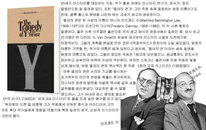 맨프레드 리(Manfred Lee:1905~1971)와 프레더릭 다네이(Frederic Danay:1905~1982). 두 사촌형제의 '필명'이자 그들 작품의 주인공 '탐정'의 이름인 '엘러리 퀸(Ellery Queen)'의 소설은 중학교 때 단 한 권, [이집트 십자가 미스터리(비밀)](1932) 뿐이었고 나중에 커서는 해당 책은 물론 그 작가와 탐정 이름마저 잊혀졌다.