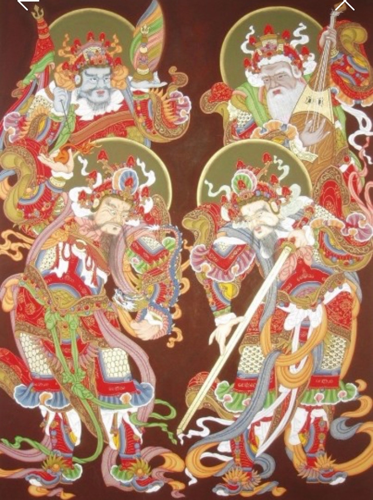 '오행'은 각기 '동서남북(東西南北)'과 '중앙(中央)'을 이른다. '동(東)'은 '목(木)'이요 '청(靑)색', '서(西)'는 '금(金)'이요 백(白)색', '남(南)'은 '화(火)'요 '적(赤)색', '북(北)'은 '수(水)'요 '흑(黑)색'이며, 만물을 낳는 '토(土)'는 '중앙(中央)'이요 '황(黃)색'이다. 유교의 '인(仁)-의(義)-예(禮)-지(智)'와 '중앙'의 '신(信)'이며, 불교의 '사천왕(지국-광목-증장-다문)'과 '중앙'의 부처에 대비되는데, 각 방향에 색깔을 입히면 '도교'적 색채가 함께 입혀진 것이리라. 예를 들어 동쪽을 지키는 지국천왕의 얼굴이 푸르거나 북쪽 다문천왕의 얼굴이 검은 경우 말이다.