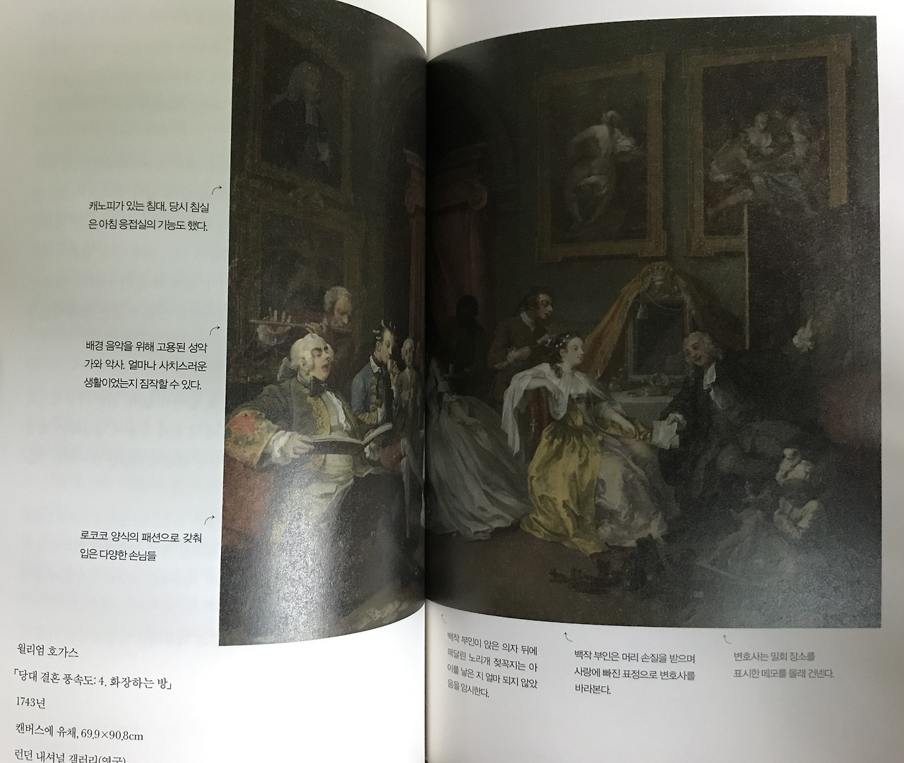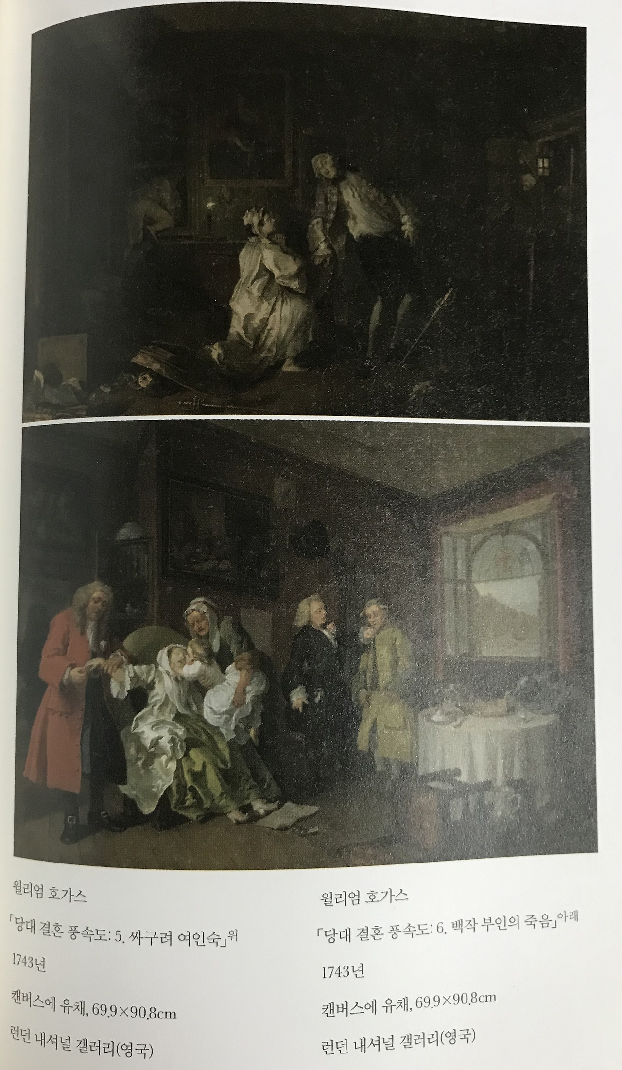 지금은 영국의 유명 화가로 남았지만 혁명으로 들끓기 전 18세기 당시 '로코코' 유럽의 영국 화가 윌리엄 호가스는 '만화 작가' 같이 알려져 있었다. '만화'도 '영화'도 없던 당시에 비해 현대로 치면 한 편의 '영화' 또는 시사풍자 '만화'를 상영하듯 호가스는 연작을 그렸다. 싸구려 술인 '진'이 애기들 우유보다 더 싸서 런던의 모든 빈민이 물처럼 마시다가 지옥처럼 변해가는 '진의 거리'나, 귀족으로서 유산을 물려받았으나 술, 도박, 여자로 탕진하고 정신병원에 갇혀 생을 마감하는 '방탕아 일대기'는 당대 현실을 사실적으로 그리고 있다. 몰락하는 귀족 집안에 딸을 강제로 시집보내 명예를 얻으려는 졸부가 있었는데, 애초에 사랑 없이 맺어진 이 젊은 부부는 각자의 사치스러운 삶을 살던 중 부인이 불륜을 저지른 장면을 목격한 남편이 결투 중 살해당하고 결국 부인은 매독균에 감염된 어린 아들을 두고 시골에서 자살로 파국을 맞는다는 아주 우울한 이야기가 호가스의 [당대의 결혼 풍속도] 연작이다.