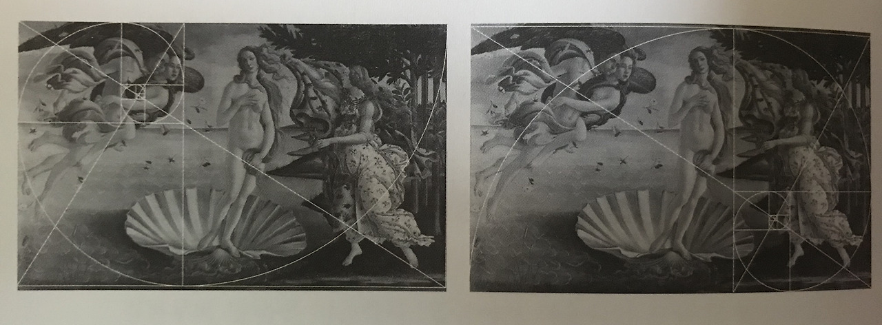 조개를 탄 비너스는 그림의 주인공으로서 '초점'이자 그 자체로 화면을 반으로 가르는 '구조선'이며, 좌측 서풍의 신 제피로스와 우측 계절의 신 호라이의 몸짓을 통해 '회전형 경로'를 그린다. 세로로 삼등분된 '삼분할 구도'로 전체 균형을 맞추면서 '직사각형 속 정사각형'을 구분하는 '래버트먼트(rabatment)' 선을 중심으로 대각선을 그어보면 그 교차되는 안정된 구역에 주인공(초점)이 안착되어 전체적인 안정감을 준다. 마지막으로 좌우 등장인물들은 '황금비율'과 '프랙탈(같은 모양의 반복)'로 수렴된다.