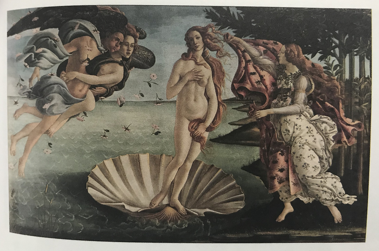 그리스 신들의 반란으로 제우스의 아버지 크로노스가 자신의 아버지 우라노스의 성기를 잘라 내다버린 먼 바다의 거품에서 태어난 미의 여신 비너스(아프로디테)가 조개를 타고 육지로 올라오는 유명한 장면이다. 제우스와의 사이에 큐피드를 낳고 헤르메스와 관계하여 자웅동체인 헤르마프로디테를 낳고 전쟁의 신 마르스와 동침하여 공포의 신 포보스, 술의 신 바커스와도 바람 피우고 나서 남편인 헤파이스토스에게로 돌아간 미의 여신이다.
