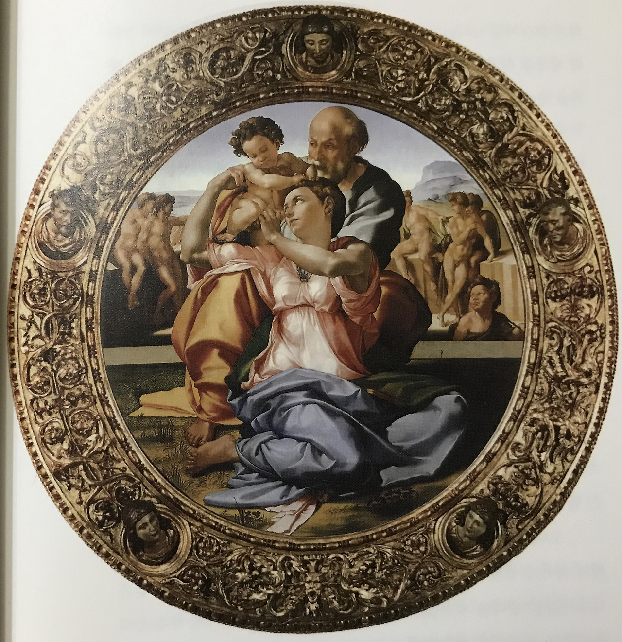레오나르도 다빈치, 라파엘로 산치오 등과 같이 16세기 르네상스 전성기(친퀘첸토)를 대표하는 미켈란젤로는 회화와 조각, 건축 등에서 거대한 스케일로 유명하다. 시스티나 예배당의 대작 [최후의 심판]을 거의 혼자 완성했을 정도로 무리했으나 90세까지 장수를 누렸다. 피렌체의 거상 도니 가문은 20대에 이미 [피에타] 상과 [다비드] 상을 만들어 명성을 떨치던 미켈란젤로에게 젊은 부부에게 아이가 생긴 것을 축하하기 위해 '톤도(원형 그림)' 형식의 그림을 의뢰했고, 미켈란젤로는 마리아와 아기 예수, 그리고 요셉이 등장하는 [성 가족]을 완성했다. 그림의 가로선 너머의 '이교도'적인 그리스식 청년들을 배경으로 이 가로선을 넘으면 '기독교' 세계로 진입한다. 그 경계에 앉은 아이는 세례 요한이다. 동정녀 마리아는 중앙에서 르네상스식 육체를 자랑하며 아기 예수를 어색하게 받고 있는데, 예수의 양아버지 요셉은 지나치게 늙었다. 이후 '성 가족' 작품에서도 그는 갈수록 늙어가는데, 마리아와 잠자리도 들기 전 '수태고지'라는 청천벽력 같은 소식을 듣고 '신'의 명령으로 파혼도 못한 채 예수를 키워야 했던 그는 마리아의 '처녀성'을 지키기 위해 명화 속에서 '늙은이'가 될 수 밖에 없었다고 한다.