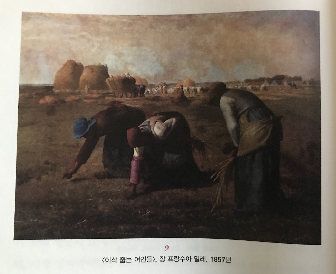 프랑스 시골 바르비종의 먼 배경을 등지고 이삭을 줍는 세 여인은 그림의 주인공이되, 현실에서는 저 멀리 추수를 하는 농부들로부터 소외된 시골의 과부들일 것이다. 구약성경에 나오는 "너희 땅의 곡물을 벨 때에 밭 모퉁이까지 모두 베지 말며 떨어진 것을 줍지 말고 그것을 가난한 이와 거류민을 위하여 남겨두라"는 말처럼 밀밭의 구석에서 '찌꺼기'들을 거두고 있는 세 주인공은 성 삼위일체를 의미하는 금색, 빨강과 파랑색의 모자를 쓰고 있다. 동시대 프랑스 귀족 시인 보들레르는 '육체 노동자'를 신성하게 그림으로써 지배계급을 위협한다며 밀레를 매우 싫어했다는데, 사실주의 작가 구스타프 쿠르베 못지 않게 바르비종파이자 인상주의 작가 장 프랑수아 밀레 또한 그림을 현실에 대한 '사실적 묘사'의 무기로 썼다.