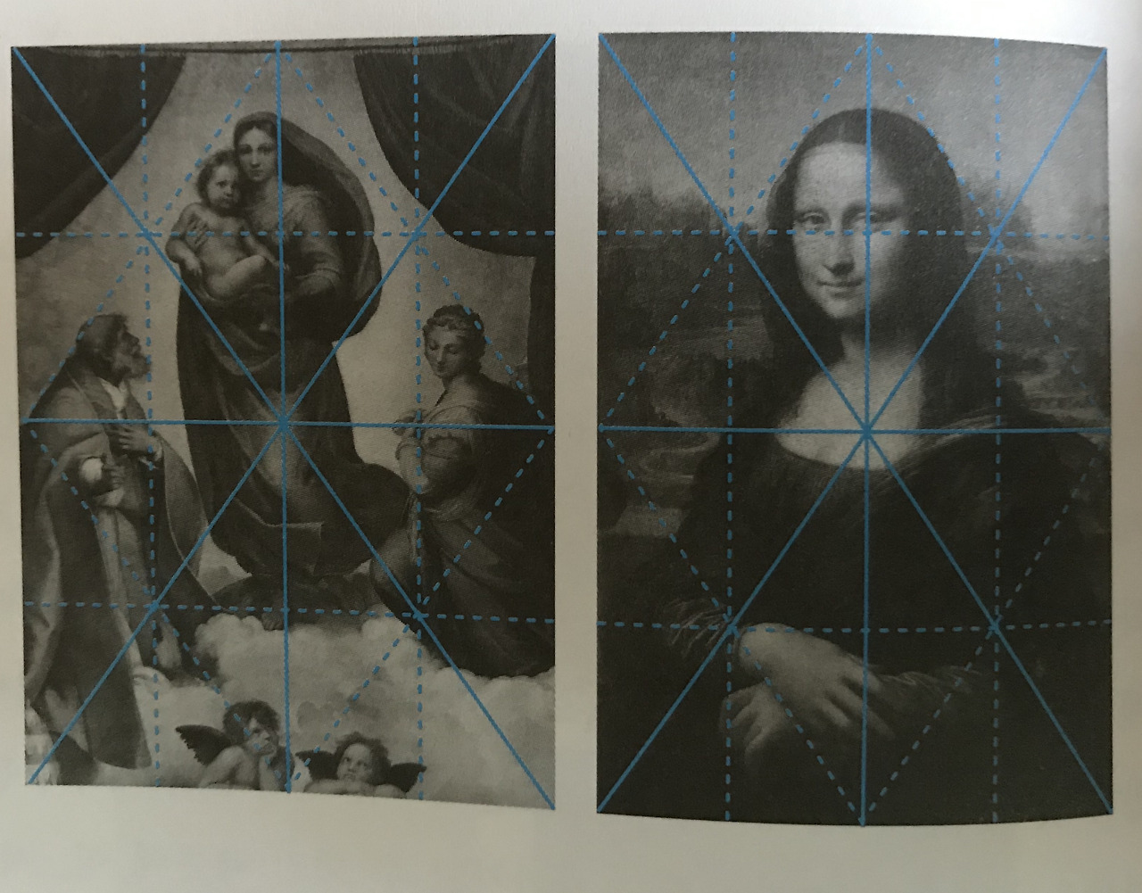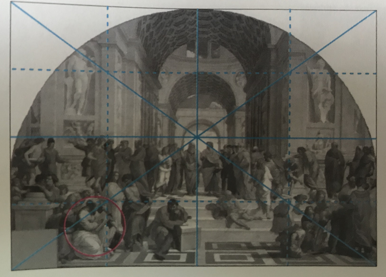 이 작품은 그냥 '마스터 패턴'으로서 '십자선'과 '대각선'만 그려 넣으면 주인공(초점) '성 가족'이 균형있게 배치된다. 거기에 가로세로 '삼등분' 선들을 그으면 마리아가 쏙 들어간다. '이교도' 청년들은 원근법과 좌우 대칭을 그대로 재현하고 있다.