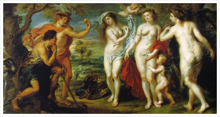 트로이 전쟁의 영웅, 아킬레스의 부모 결혼식에 초대받지 못한 불화의 여신 에리스가 식장에 던진 황금사과에는 '가장 아름다운 여신에게'라는 꼬리표가 달렸고, 서로 예쁜 척 하는 세 여신인 헤라, 비너스, 아테나가 서로 사과를 차지하려다가 트로이 왕자 파리스에게 심판을 맡겼다. 비너스는 스파르타 왕비 헬레네를 강탈할 수 있게 하겠다는 약조로 사과를 차지했고 결국 트로이 전쟁으로 치달은 이야기의 발단인 '파리스의 심판'을 바로크 거장 파올로 루벤스는 연작으로 몇 편 그렸다.