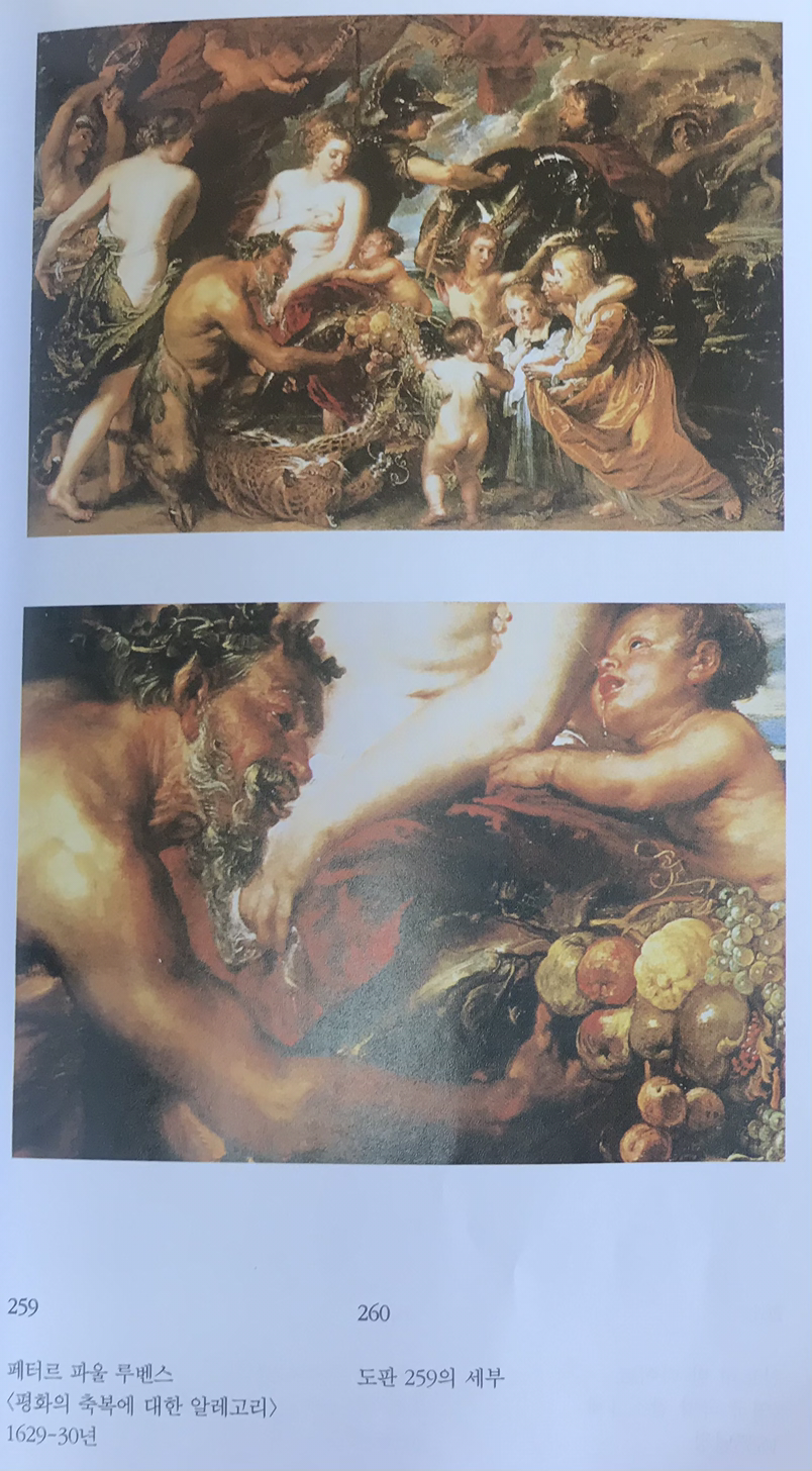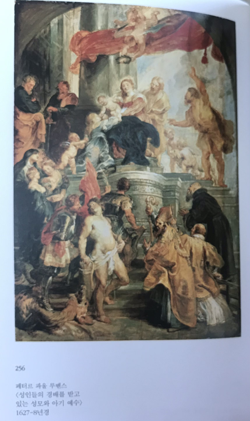 "... 북유럽 사람으로 카라치나 카라바조 시대 로마의 분위기를 가장 직접적으로 접한 화가가 있었다. 그는 바로 플랑드르 출신의 페터르 파울 루벤스... 그 이전의 플랑드르 화가들은 대부분 작은 그림만을 그렸다. 그런데 그는 이탈리아로부터 교회와 궁전을 장식하기 위한 거대한 화면을 선호하는 취향을 플랑드르에 도입했는데... 그는 거대한 화면 속에 인물들을 배치하고 전체 효과를 높이기 위해 빛과 색채를 구사하는 기술을 공부했다... 마술사와 같은 그의 솜씨는 모든 것을 생기발랄하고 강력하고 유쾌하게 살아숨쉬는 것으로 만들 수 있었다... 그 이전의 티치아노보다도 한층 더 루벤스는 붓질을 자신의 가장 중요한 수단으로 사용했다... 그것은 소묘적인 수단에 의해서가 아니라 '회화적인' 수단에 의서 생겨난 것... 고전적인 아름다운의 '이상화'된 형태가 그에게는 무용지물이었다."