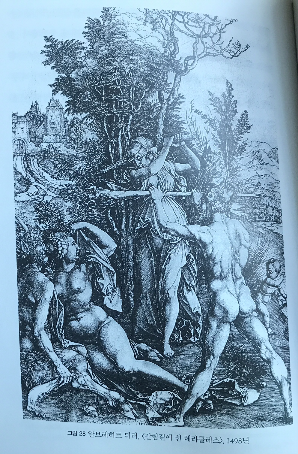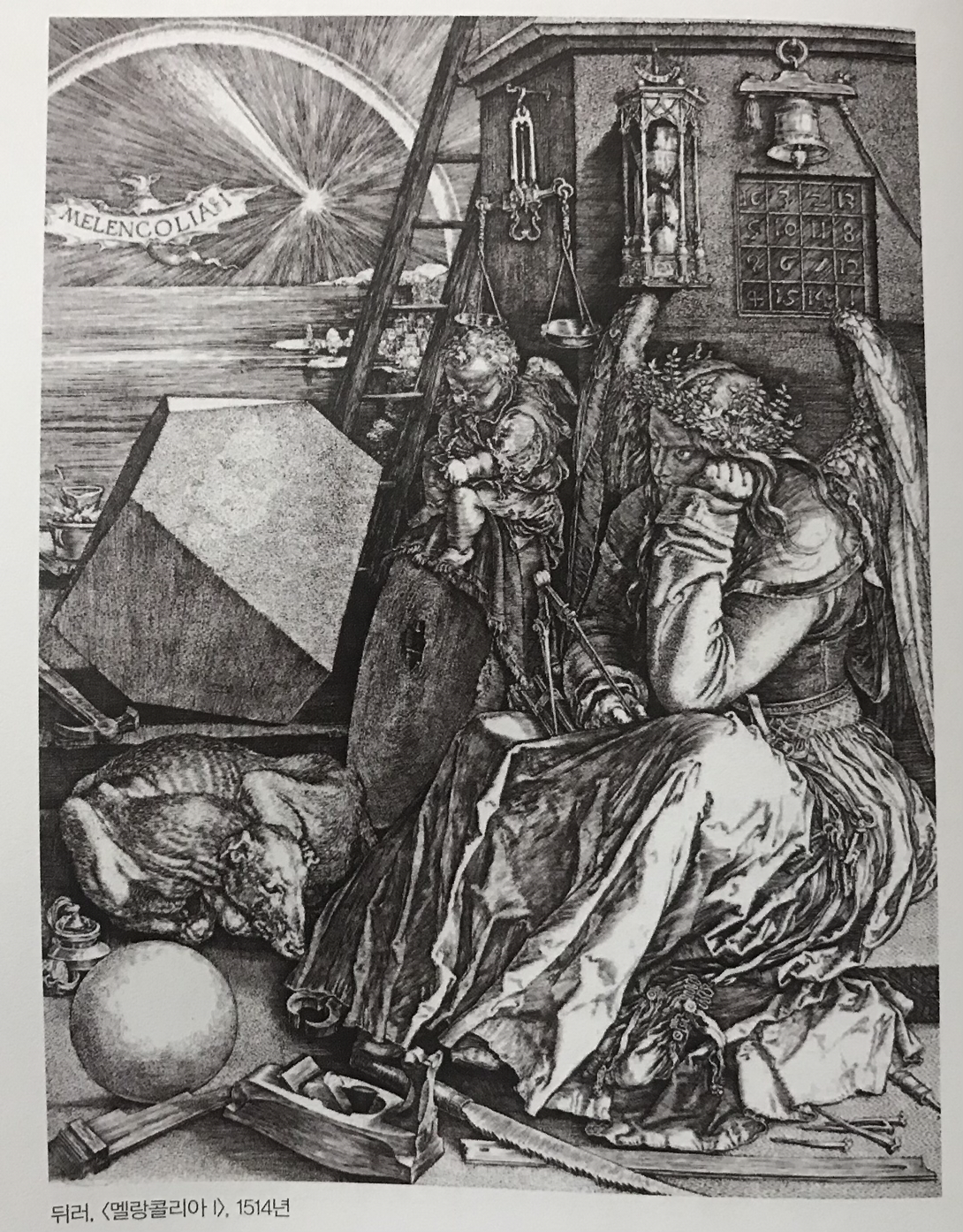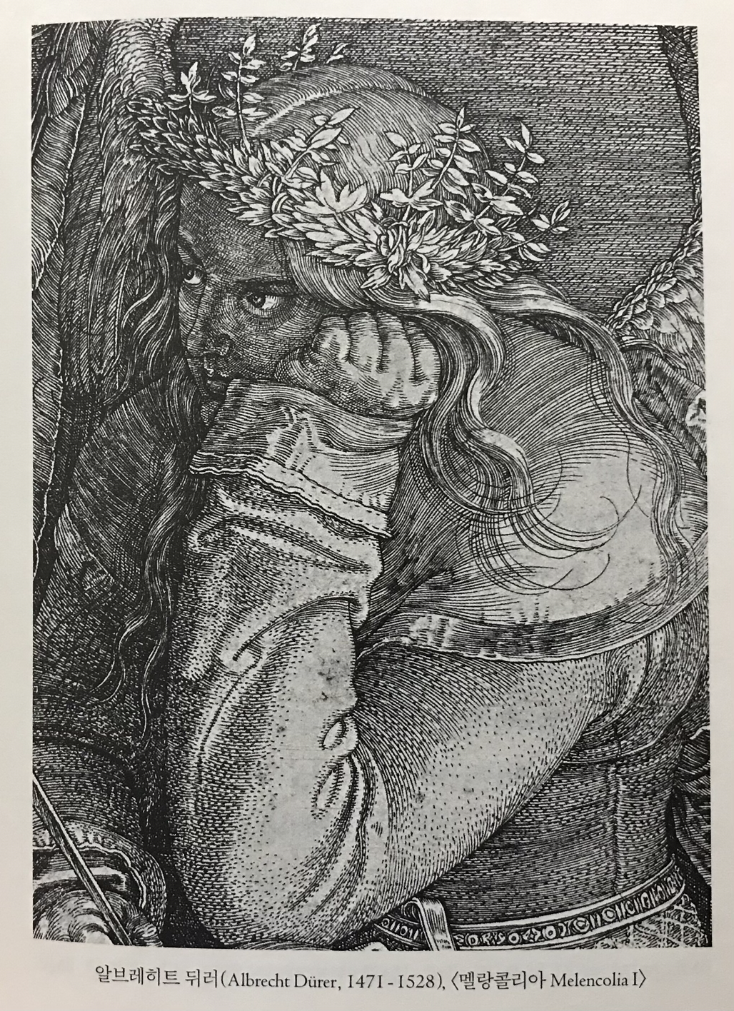 미켈란젤로, 라파엘로 등 대표적인 이탈리아 르네상스 거장들은 대규모 아카데미 조직을 양산했고, 북유럽의 화가들은 남유럽 이탈리아 유학을 통해 르네상스 정신을 전유럽으로 확산시킨다. 독일지역 '자유도시' 뉘른베르크의 알브레히트 뒤러(Albrecht Durer : 1471~1528)는 당시로 보면 '국제주의자(cosmopolitan)'였고, 최초의 '상업적' 미술가였으며, 북유럽 고딕과 남유럽 르네상스를 융합시킨 또 하나의 '혁신'적 '미술가'다. 20세기 독일 출신 미국 미술사학자 에르빈 파노프스키는 그의 '도상학(도상해독:iconography)'과 '도상해석학(도상연구:iconology)'을 통해 뒤러의 작품 [멜랑콜리아1]과 [갈림길에 선 헤라클레스]를 분석한다. 미술사학자 신준형은 사실 '도상학'과 '도상해석학'의 경계는 모호하고 구분도 어렵지만, 그림 속 상징의 '해석(전형:Type)'을 넘어서 당대의 문헌사적 분석을 통해 '문화적 징후'까지 읽어냄으로써 '자연의 질서(cosmos)'에 비견되는 '문화의 질서(tabula)'를 구축하려는 파노프스키의 '철학'적 시도는 미술사가들이 "넘어야 할 큰 산"이라고 평가한다. 파노프스키는 [알브레히트 뒤러의 생애와 예술](1943)에서 뒤러의 [멜랑콜리아1]을 화가 자신의 '정신적 자서전'으로 본다. 후견인에 의지하지 않고 대량제작이 가능한 판화와 화가 고유의 '모노그램'을 통해 미술을 대중화하면서 '상업'적으로 성공한 '독립'된 '미술가'였던 뒤러는 그만큼 자부심이 강했다. 북유럽 르네상스를 이끌던 그는 수학에도 능했고 세계의 이치를 고민하는 예술가의 반열에서 자신을 거의 날개달린 신이나 천사의 지위로 위치짓는다. 좌측 상단의 작품 제목 위로는 여지없이 기독교적 공포의 상징인 혜성이 자비의 상징인 무지개 사이로 떨어지고 있다. 파노프스키의 '도상해석학'에 따르면 뒤러의 [멜랑콜리아1]은 '신'의 반열에 오른 "고뇌하는 예술가의 자화상"이다.