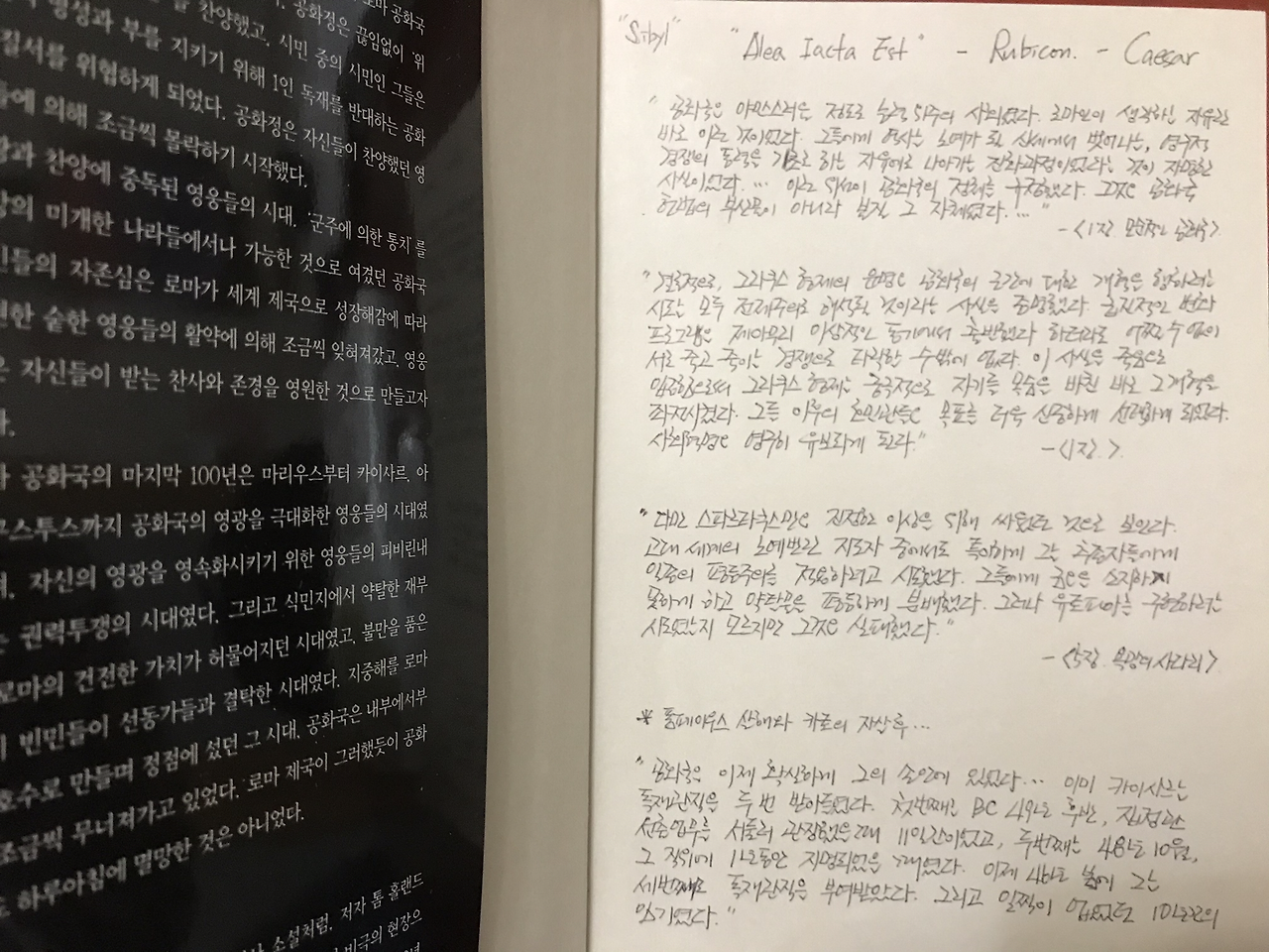 로마는 늑대 젓을 먹고 자란 로물루스-레무스 쌍둥이 형제가 기원전 753년에 건국 후 군사력으로 주변 지역을 점차로 복속시키면서 군주국이 되었으나, 기원전 509년 타르퀸이라는 독재자가 시빌(Sibyl)이라는 노파의 예언을 무시한 후 쫓겨나고 시민투표에 의한 '민주정'을 세웠으며 이후로도 이 '공화정'이 위기에 처하면 원로원이 보관해온 '시빌 예언서'를 들춰보며 시민 모두가 한마음으로 공화국을 지켜왔다는 것이다. 아마도 아주 고대의 '시빌 예언서'는 독재에 항거한 민중폭동의 은유가 아니었을까 싶다. '공화국'에서 원로원으로부터 선출된 임기 1년의 집정관은 2명이 서로 견제했고 호민관은 귀족이 아닌 시민이 뽑은 대표로서 서민정책을 펴는 귀족이었단다. 로마 창시자 로물루스는 카피톨리누스 언덕을 중심지 삼아 아벤티누스 지역의 동생 레무스를 살해하고 로마를 차지했다는데 위례(서울)를 기반 삼아 형제 비류를 죽이고는 미추홀(인천)을 먹은 백제 시조 온조 이야기와 닮았다. 로마는 승자 로물루스 지역 카피톨리누스가 귀족들의 대저택, 패자 레무스의 지역 아벤티누스 서민들의 '쪽방촌' 또는 '닭장촌'으로 나뉘기도 했는데 이 서민아파트 값 또한 엄청나게 비쌌으며 로마 전성기 인구가 고대 당시에 이미 100만명이 넘었다는 기번의 이야기를 들으면 지금의 서울, 현대사회 대도시의 모습과 꼭 닮았다. 트로이 전쟁 후 피난온 아에네이아스(Aeneas) 후손인 율리우스 가문은 로마의 근본있는 귀족인데 율리우스 카이사르는 아마도 이 집안 출신 정치인이었던 것 같다. 로마 시민들의 지지를 얻기 위해 빚내서 돈과 금품을 막 뿌려대고 남유럽 지역인 갈리아 원정 등의 군사적 성과를 통해 명성과 능력을 인정받은 카이사르는 1차 삼두정치 과정에서 당연히 당대 실력자들로부터 견제를 받았는데 경쟁자들을 치기 위해 카이사르가 던진 '주사위'가 바로 '루비콘 도강'이었다. 크라수스, 폼페이우스, 카토 등을 제압한 카이사르는 이전 세대 술라가 역임한 '독재관' 10년 임기 시작 초반에 "부르투스, 너마저?(Et tu Brute?)" 한마디 남기고 살해되었다는데, 그만큼 '공화국'을 애정했던 카이사르의 동료 부르투스가 로마 광장에서 만세를 부를 때 이를 보는 로마 시민들의 시선은 차가웠단다.