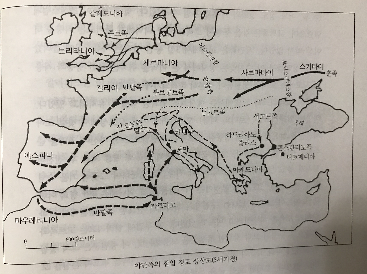 "역사가는 이런(형이상학적/종교적) 고매한 고찰이 옳으냐 그르냐를 주제넘게 논하지 않고, 다만 경험에 의해서 입증할 수 있는 관찰에 만족해야 할 것이다. 인간은 자연의 격변(365년경)보다는 오히려 인간의 격정에 따른 재앙을 더욱 두려워해야 하기 때문이다... 지진이나 해일, 태풍이나 화산폭발로 인한 재난은 일반적인 전쟁의 피해에 비하면 아무것도 아니다... 발렌스 황제의 치세로부터 시작되었다고 할 수 있는 로마제국의 몰락 과정에는 개인의 행복과 안전이 직접적으로 침해받았으며, 당대의 기술도 노동의 성과들도 모두 스키타이와 게르마니아의 야만인들에 의해서 난폭하게 손상되었다. 훈족(흉노족)의 침입으로 서로마의 여러 지방으로 쫓겨간 고트족은 40년도 못되는 기간에 도나우 지역에서 대서양으로 이동하게 되었고, 그들의 군사적 승리로 자기들보다 훨씬 더 야만적인 수많은 부족들의 이동과 침입의 길을 열게 되었다."