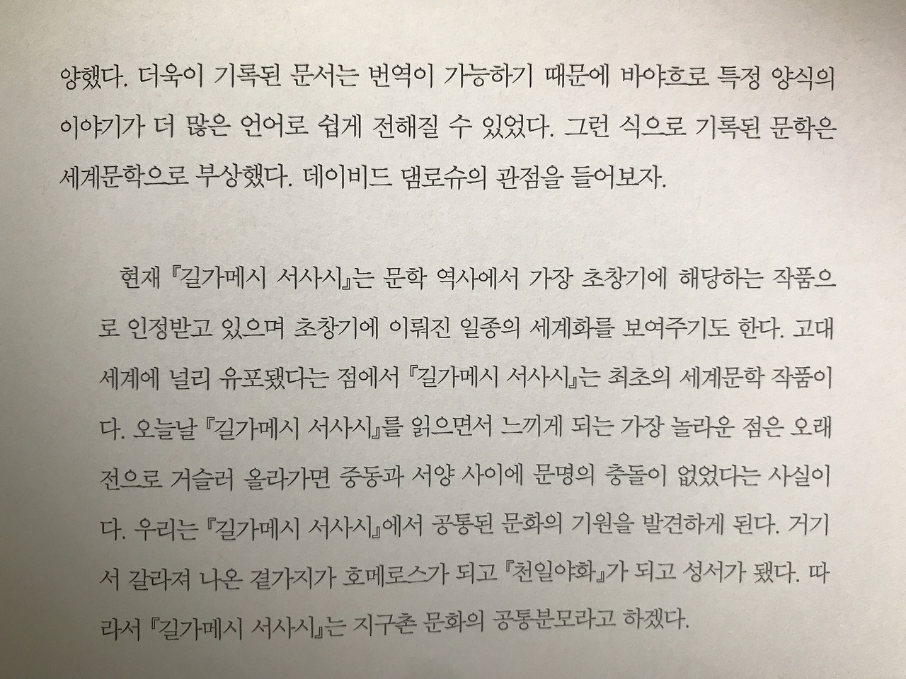 하인리히 슐리만에게 고대 그리스 문명 발굴의 꿈을 꾸게 했던 2천8백년 전 호메로스의 대서사시 [일리아드]와 [오디세이아]나 1천2백년 전 게르만족 영웅 서사시 [베어울프]보다 훨씬 전인 약 4천년 전에 인류 최초의 문자로 기록된 '세계 문학'의 시초인 [길가메시 서사시]는 '죽음'이라는 숙명과 그 앞에서의 공포를 딛고 더 나은 미래를 만들어 가려는 인간의지를 인류라는 종(種)에게 심어준 최초의 '사상적 문헌'이다.