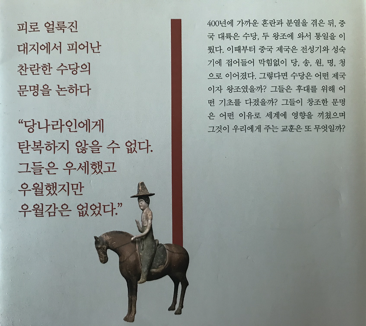 "당나라인... 그들은 우세했고 우월했지만 우월감은 없었다... 문명은 사유재산이 아니고 천하의 모든 사람에게 속한다고 믿었다.