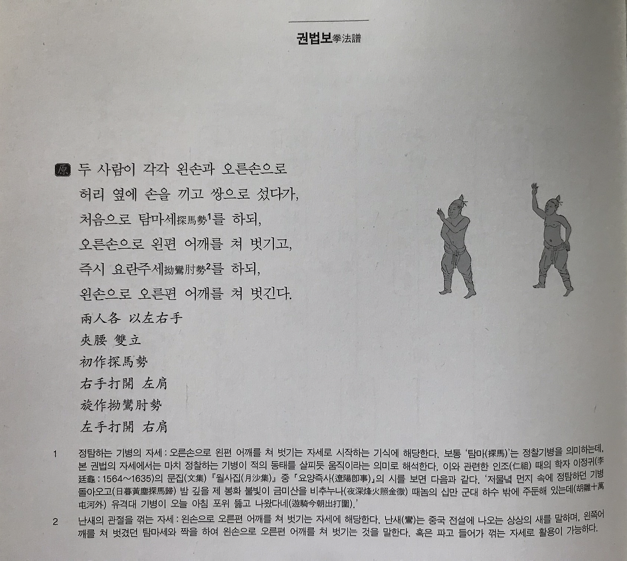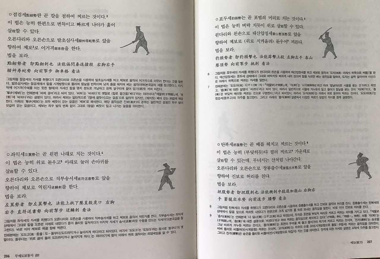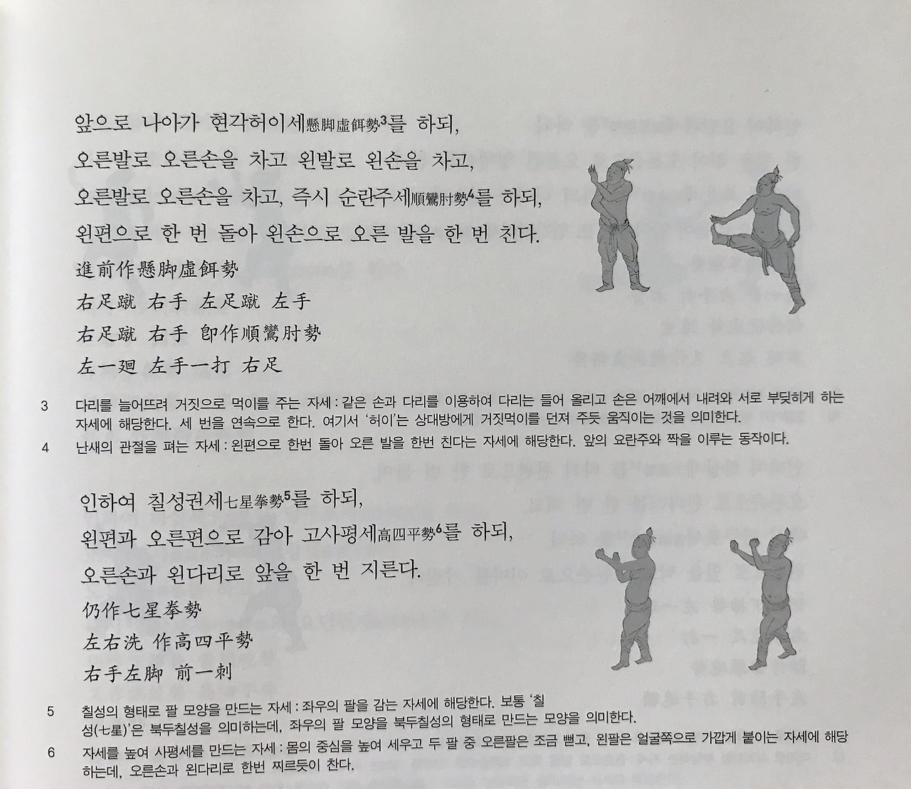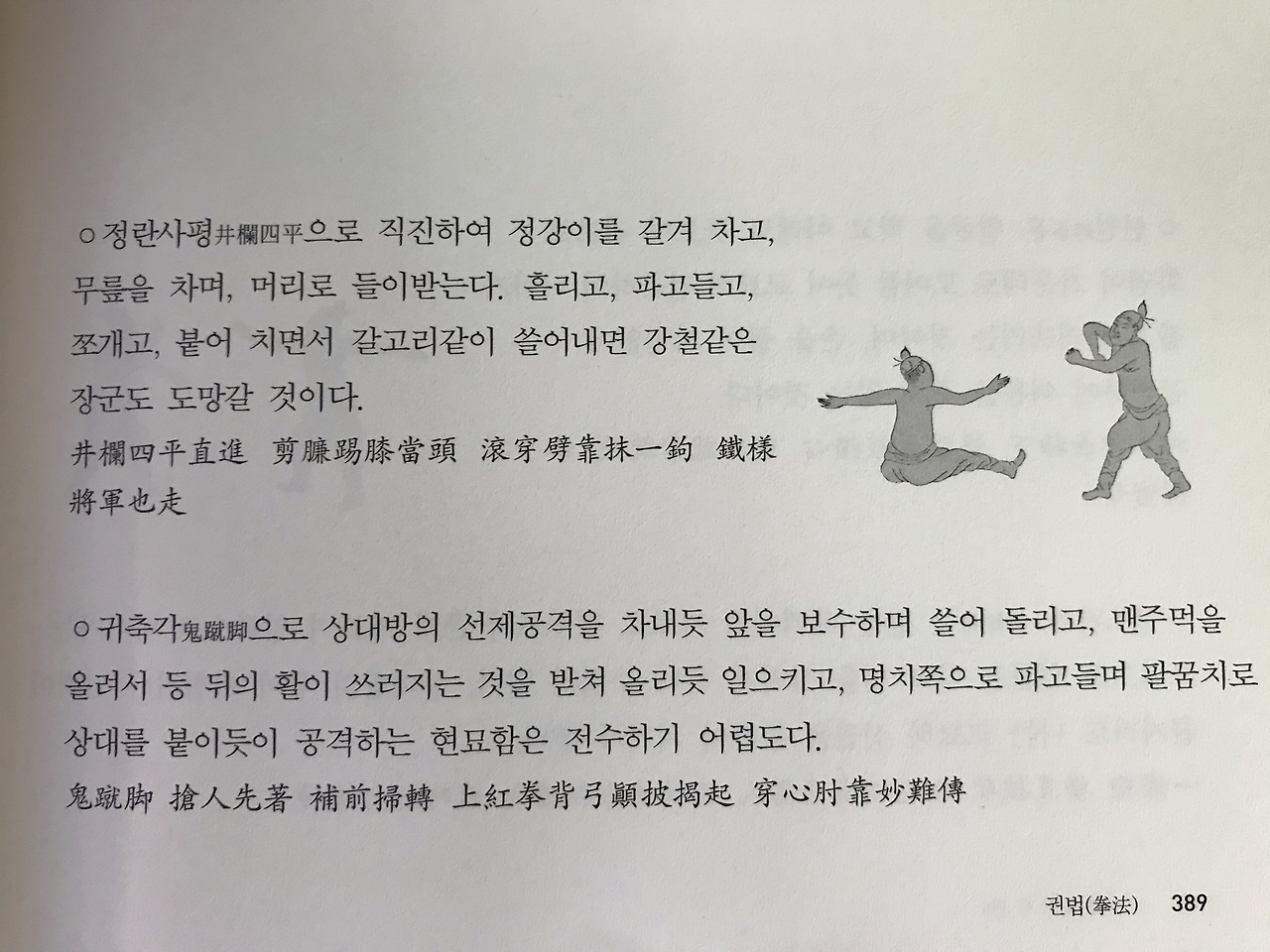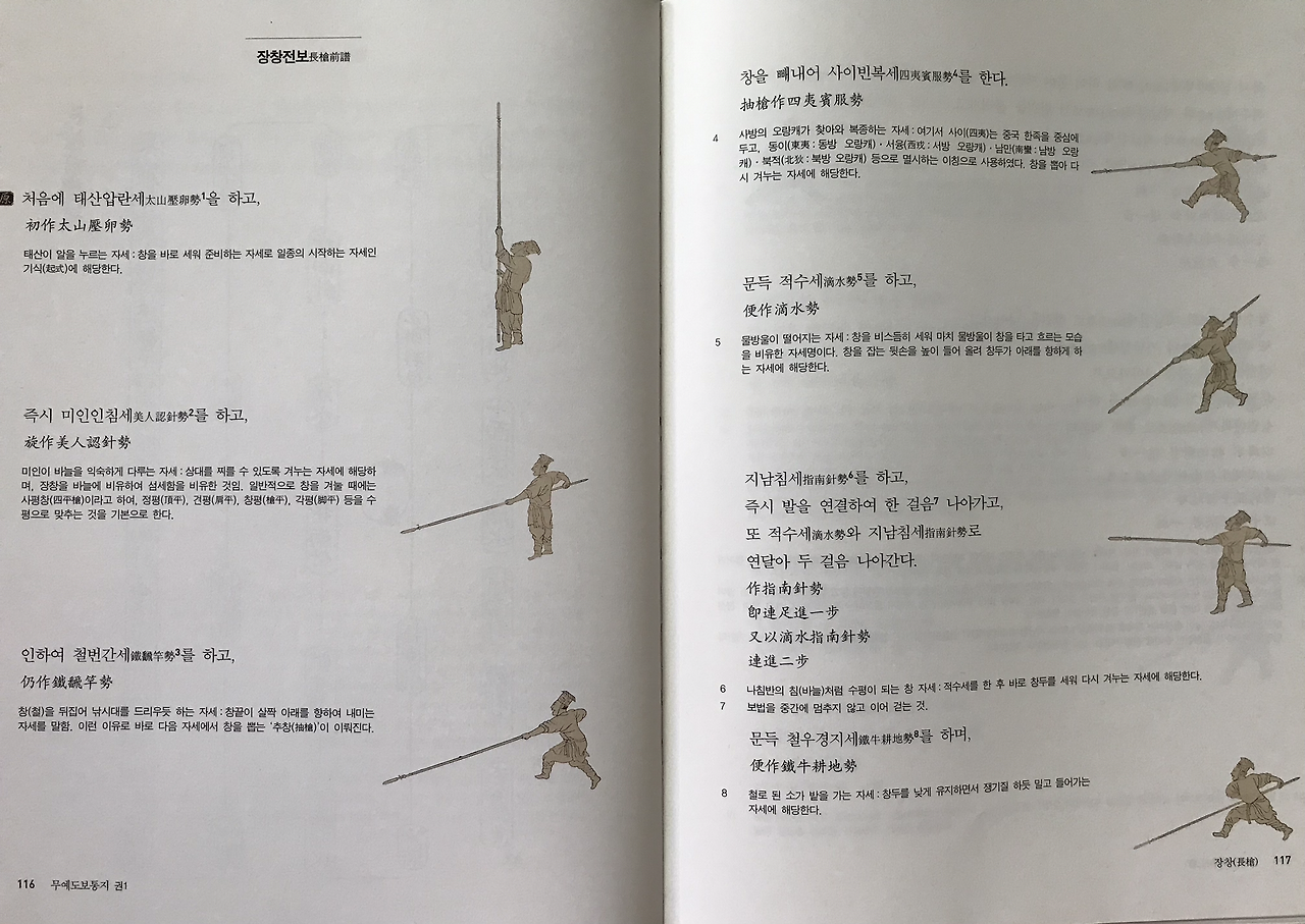 각 자세들은 '태산압란세(태산이 알을 누르듯 창을 든 자세), '거정세(솥을 들듯 검을 치켜든 자세)', '복호세(호랑이처럼 낮춘 자세)', 표두격(표범이 머리를 공격하는 것)' 등의 비유적 표현이 차고 넘친다. 몇 번 따라 해보려는데 현대인인 나로서는 구현이 쉽지 않다. 하지만 '격법(치고)', '세법(베고)', '자법(찌르고)' 등의 직접 행동 이전에 '안법(눈으로 보고)'을 최우선으로 하는 것은 싸움은 무기와 기술도 중요하나 '눈'을 비롯한 '오감'으로 상대를 사전 제압하는 '담력'을 최고로 치는 '도(道)'를 앞에 두는 사상을 잊지 않는다. '태권도', '유도', '검도', 하물며 '합기도'까지 '기예' 이전에 올바른 '도(道)'를 중시하는 바로 그 전통선상에 있다.