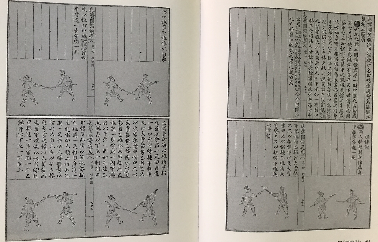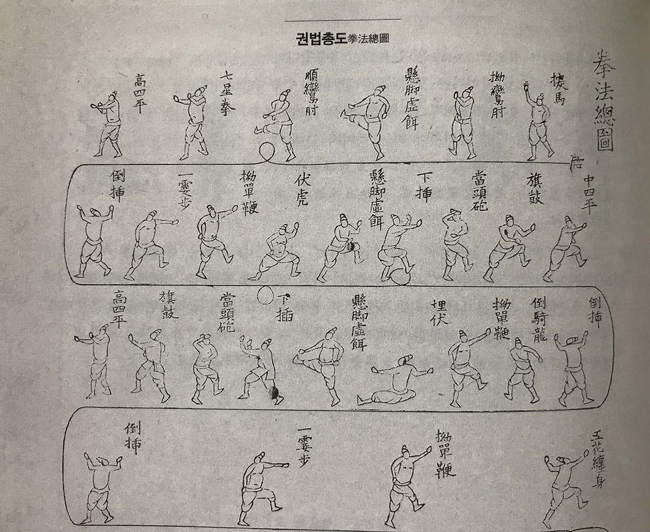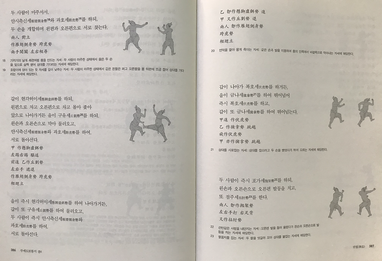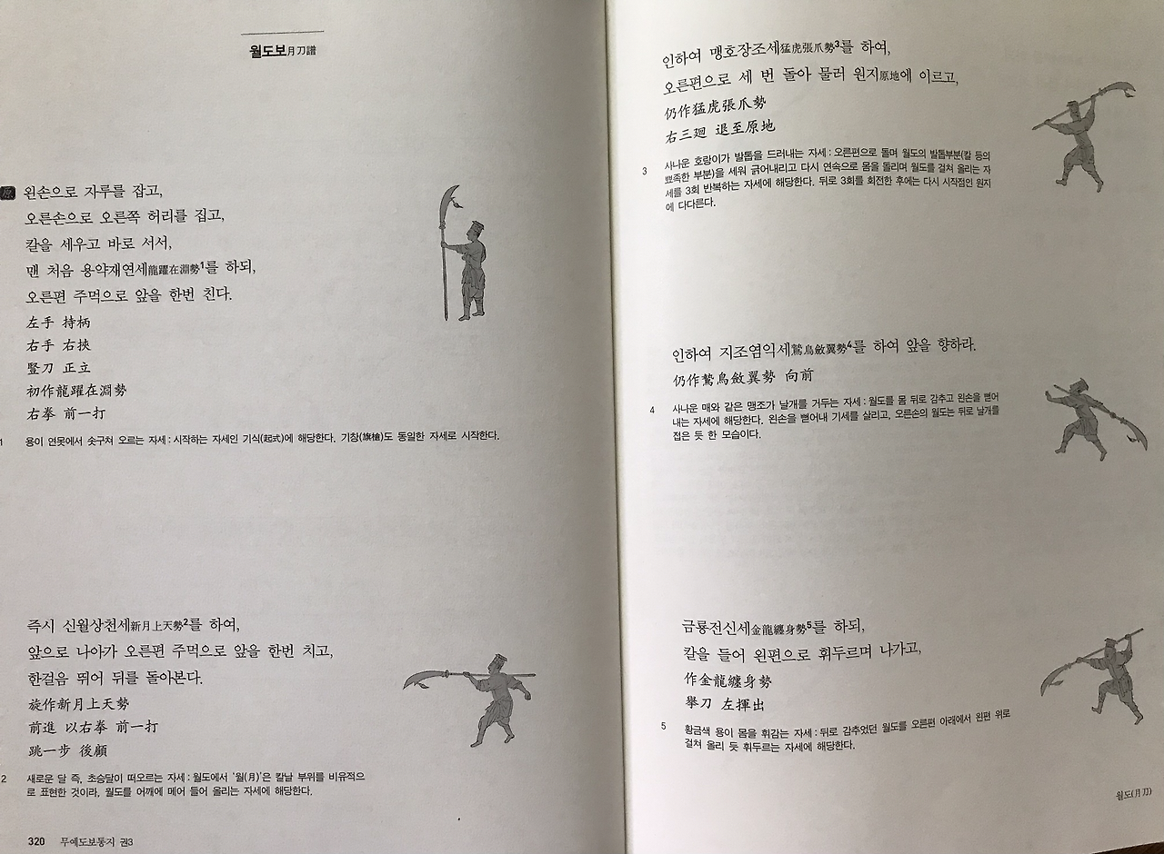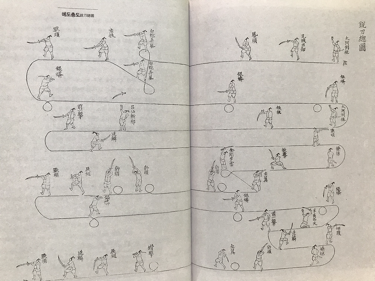 각 자세들은 '태산압란세(태산이 알을 누르듯 창을 든 자세), '거정세(솥을 들듯 검을 치켜든 자세)', '복호세(호랑이처럼 낮춘 자세)', 표두격(표범이 머리를 공격하는 것)' 등의 비유적 표현이 차고 넘친다. 몇 번 따라 해보려는데 현대인인 나로서는 구현이 쉽지 않다. 하지만 '격법(치고)', '세법(베고)', '자법(찌르고)' 등의 직접 행동 이전에 '안법(눈으로 보고)'을 최우선으로 하는 것은 싸움은 무기와 기술도 중요하나 '눈'을 비롯한 '오감'으로 상대를 사전 제압하는 '담력'을 최고로 치는 '도(道)'를 앞에 두는 사상을 잊지 않는다. '태권도', '유도', '검도', 하물며 '합기도'까지 '기예' 이전에 올바른 '도(道)'를 중시하는 바로 그 전통선상에 있다.