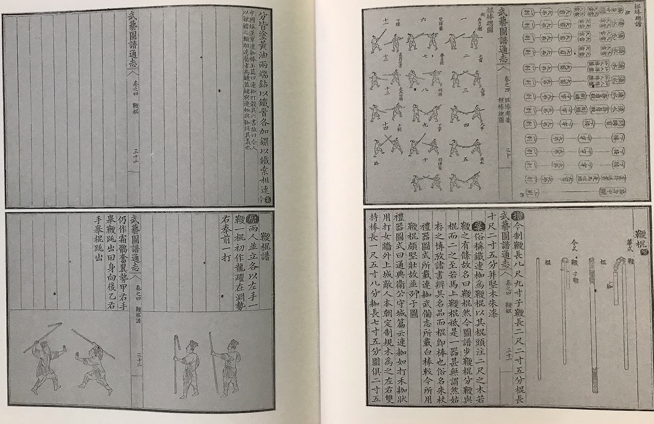 [무예도보통지]의 서문과 각 사설의 앞부분(권수)을 지나면 1권에서 '찌름을 위한 무예'로 '창'술을 다루고 2~3권에서 '베기를 위한 무예'로서 '검'술을 망라하며, 4권에서는 '치기를 위한 무예'인 권법 및 봉술과 쌍절곤(편곤)술, 기타 마상 무예를 합쳐 '24기'에 관한 그림과 설명을 상세히 기록한다. 제목의 뜻은 '무예(武藝)'에 관한 '그림과 설명(도보:圖譜)'을 총망라하고 '완전히 달통한 기록(통지:通志)'로서 '무예(武藝)'+'도보(圖譜)'+'통지(通志)'인 것이다. 참고로 조선시대 과거시험에서 '만점'을 의미하는 단어 또한 '통(通)'이었단다. 과연 '성리학자' 지식인이 되고 싶었던 군주 정조다운 작명법이다.