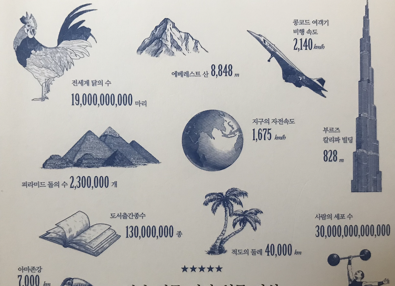 앤드류 엘리엇의 [숫자로 읽는 세상의 모든 것(Is That a Big Number?)]은 '수학'에 관한 책은 아니다. 우리 주변의 '큰 수'에 당황하지 않고 의연하게 대처하는 법을 알려주는 책이다. 정확한 수학적 논증과 정밀한 계산이 필요없는 나 같은 '문과적' 인간이 '숫자'로 이루어진 세상을 이해하는 방법을 알려주는 이 책은 '숫자'의 망망대해에서 헤엄칠 수 있는, 적어도 가라앉지 않고 뜰 수 있는 '직관'을 선사하고 있다.