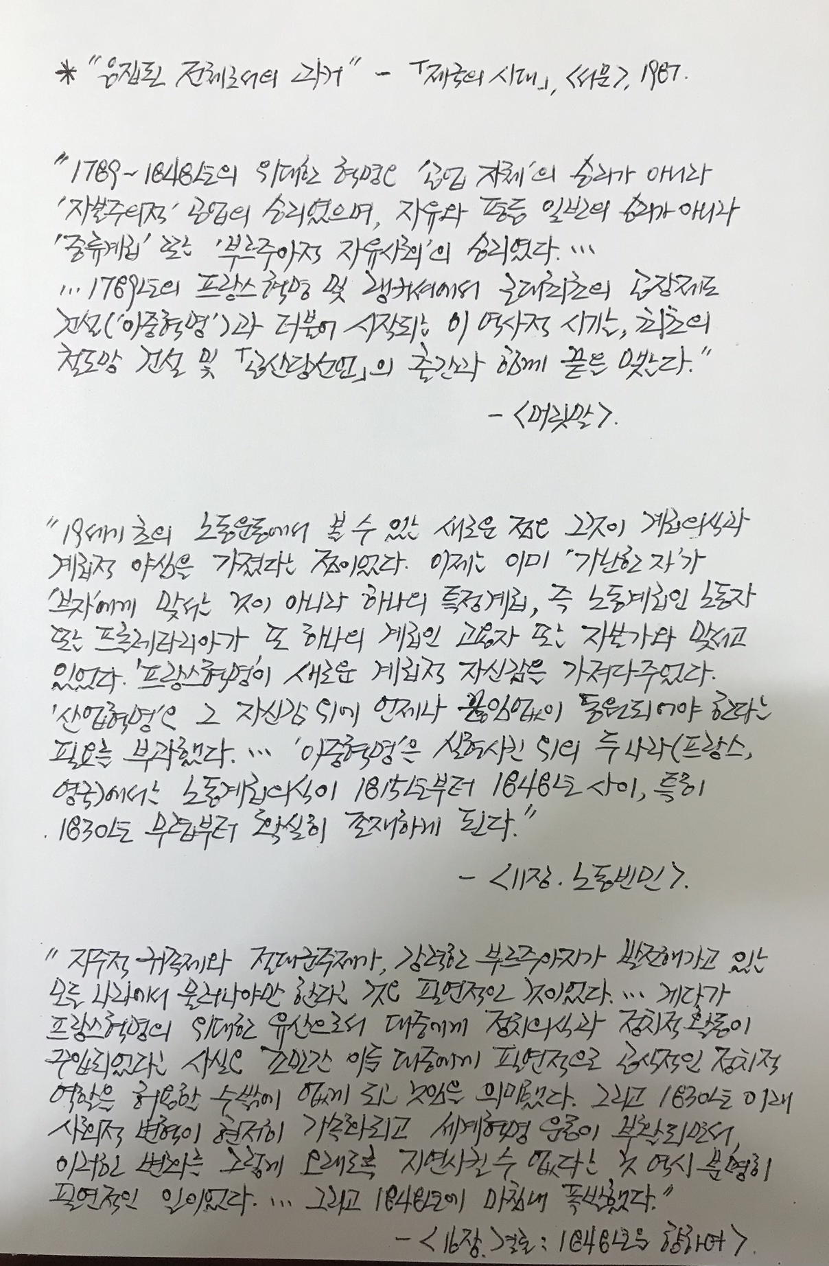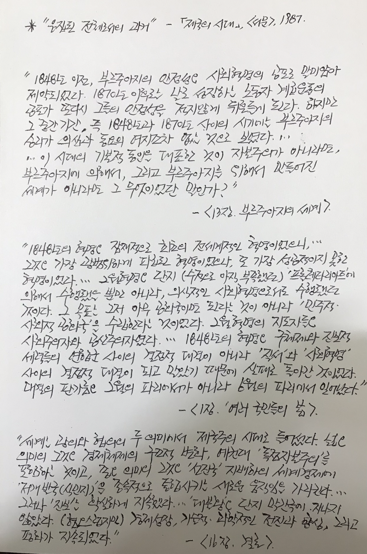 1848년 2월 파리에서 시작된 도시빈민들의 유럽혁명을 홉스봄은 [자본의 시대] 1부 전체를 할애하여 '여러 국민들의 봄'이라 명명하고는 그 시작과 실패를 고찰한다. 아마도 '프라하의 봄'을 연상하는 이 1848년 유럽 '여러 국민들의 봄'은 아직 다수가 아닌 프롤레타리아를 소수 사회주의 또는 공산주의(과학적 사회주의)가 지도했다지만 이는 결과적인 분석일 뿐 혁명에 참여했던 다수의 노동자들은 아마도 사회적 민주공화국을 바랬을 게다. 그 과정에서 나폴레옹이 혁명을 배반하고 다시 되돌린 왕정체제를 다시금 타도했지만 공화국의 권력을 잡은 후 부르주아는 칼끝을 돌려 6월까지 이어진 다수 노동자투쟁을 진압하면서 결국 노동계급의 혁명은 실패했다는 것이다. 이후 칼 마르크스는 이 1848년 프랑스에서의 '계급투쟁' 양상을 고전적으로 분석했다. 구체제가 아니라 '질서'를 외친 부르주아와의 투쟁에서 패배한 노동계급은 1848년 유럽혁명의 실패를 증명한다.