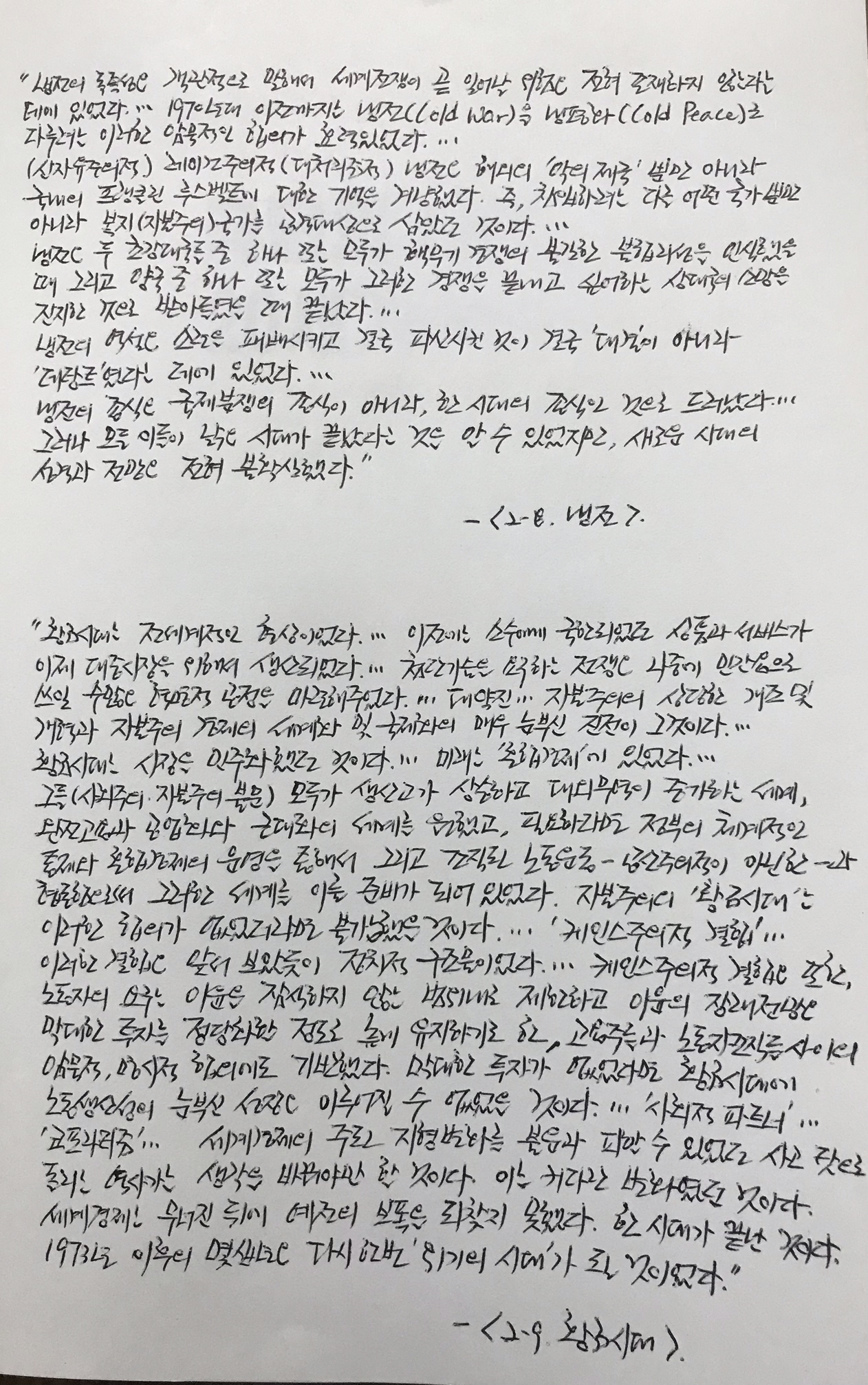 자본주의는 그 자체 모순인 경제적 대공황과 그 상황이 낳은 파시즘으로 인해 위기에 빠졌고, 그 대안 체제로 등장했던 공산주의는 '역설'적으로 '케인스주의' 또는 북유럽 사회민주주의와 같은 자본주의 '혼합경제'의 모티브가 되면서 자본주의 체제를 강화했다. 그러므로 "냉전의 종식은 국제분쟁의 종식이 아니라, 한 시대의 종식인 것으로 드러났다... 그러나 모든 이들이 낡은 시대가 끝났다는 것을 알 수 있었지만, 새로운 시대의 성격과 전망은 전혀 불확실했다."(같은책, <2-8. 냉전>)