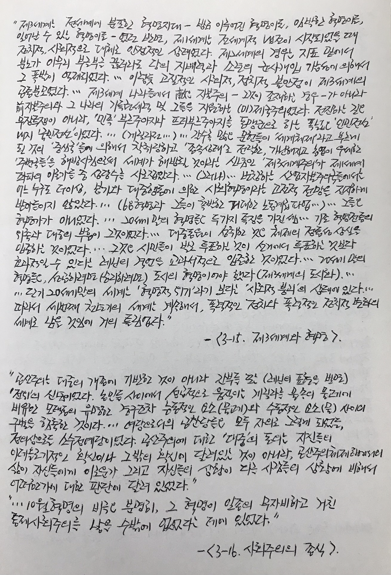 러시아 소비에트 '10월 혁명'은 "전쟁에 대한 혐오"(같은책, <1-2. 세계혁명>)로 발생한 혁명이었다. 1905년 '피의 일요일'이 일어난 배경은 제국주의 '러-일전쟁'이었고 1914년에 제1차 대전 참전한 러시아 차르체제는 1917년 '2월 혁명'으로 끝장났다. 러시아 농촌공동체(미르)를 모태로 한 노동자/농민/병사 소비에트의 광범위한 '이중권력'의 반전투쟁을 기민하게 지도하며 케렌스키의 '2월 임시정부'를 타도한 볼셰비키 '10월 혁명'은 19세기 내내 세계를 지배했던 자본주의와 그 '최고 단계'로서의 제국주의에 대한 당대의 거대한 대안이었다.
