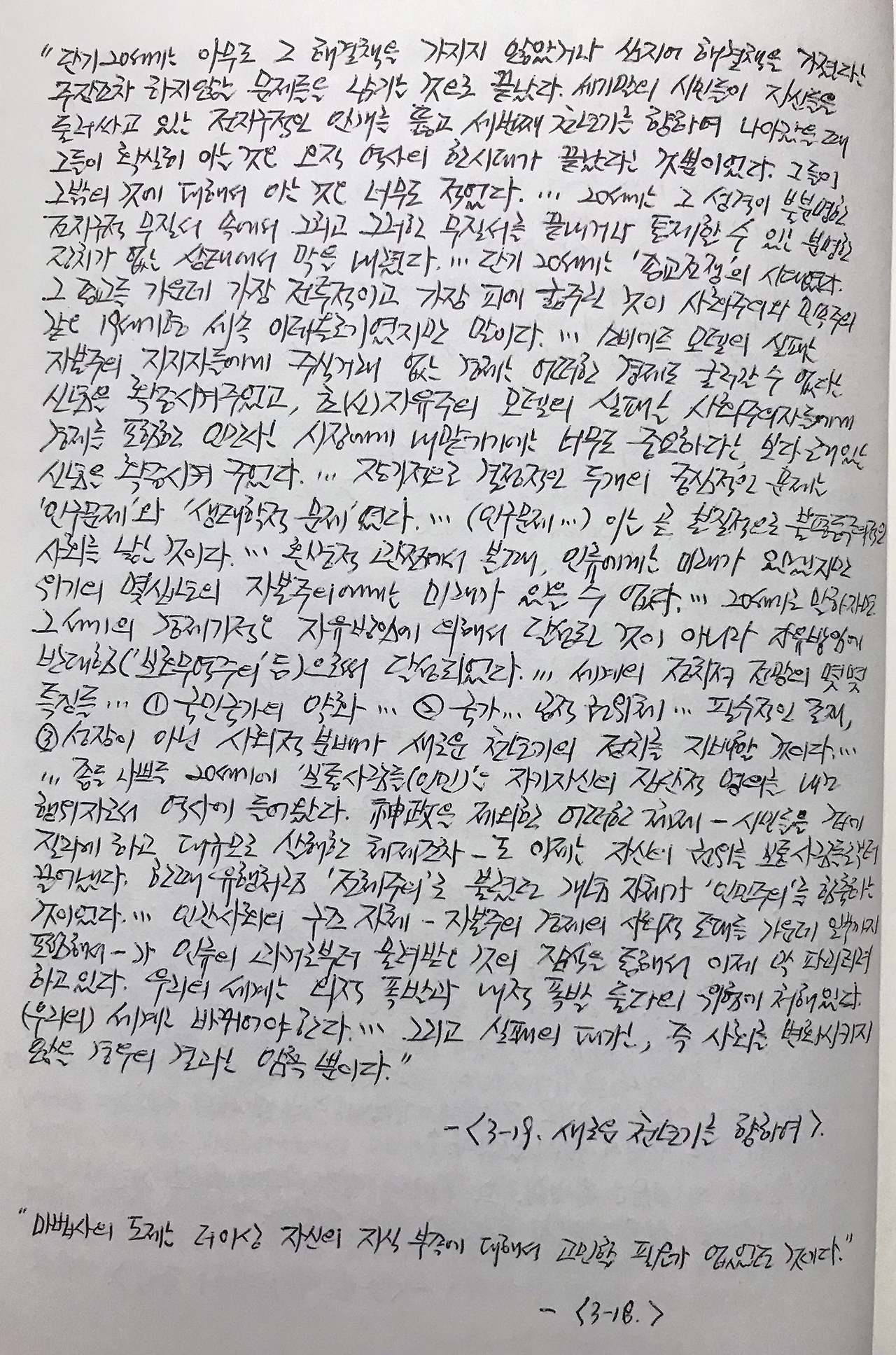 21세기의 10년 이상을 더 살았지만, 20세기 말에 가까워지면서 "새로운 천년기(21세기)를 향하여"(같은책, <3-19>) 흘러가던 1994년의 에릭 홉스봄은 당시의 '극단'적이고 '역설'적인 20세기를 돌아보며 이렇게 결론짓는다.