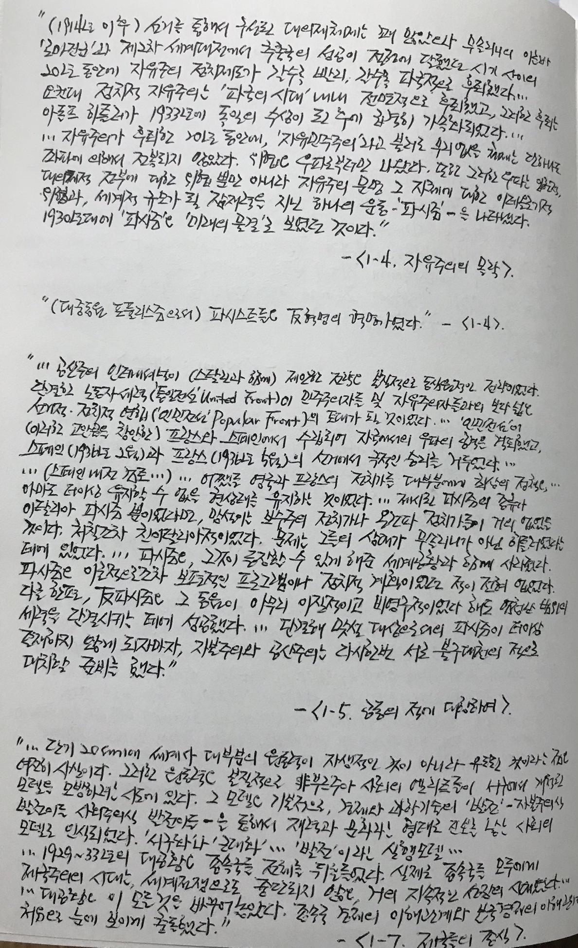 "위협은 (좌파가 아닌) 우파로부터만 나왔다."(같은책, <1-4. 자유주의의 몰락>) 즉, 제1차 제국주의 세계대전이 만든 자유주의 세계의 괴물 '파시즘'은 본질적으로는 폭력으로 지배했지만 자유주의 대의민주주의 선거를 통해 집권했다. 자유주의의 적으로 간주된 '파시즘'은 자본주의 세계 대공황이 낳은 괴물이었다. 홉스봄에 의하면, "1930년대에 '파시즘'은 '미래의 물결'로 보였던 것"이고 대중동원 포퓰리즘으로서 "파시스트들은 반(反)혁명의 혁명가"(이상 같은책, <1-4>)였다.