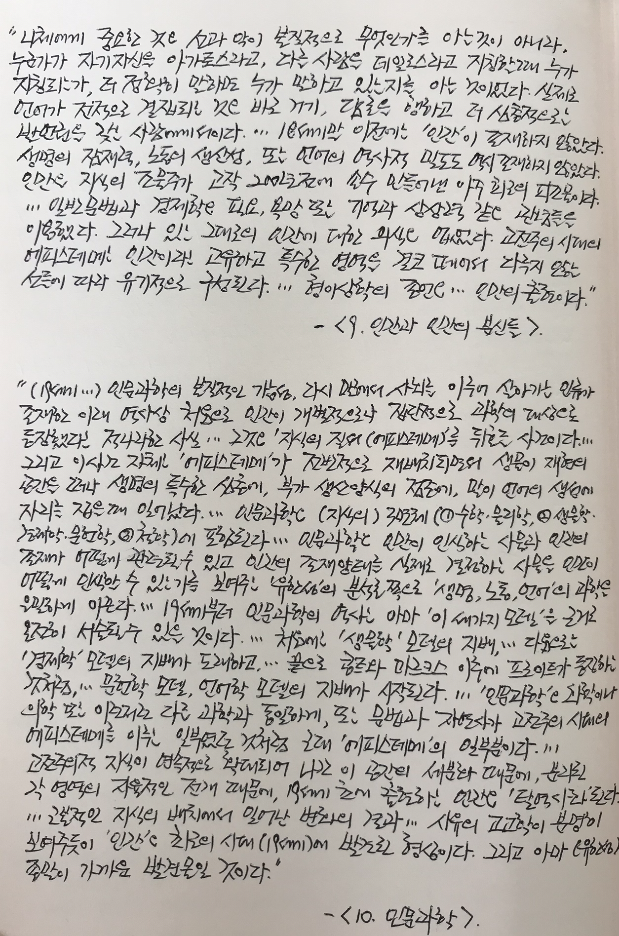 "(19세기...) '인문과학'의 본질적인 가능성, 다시 말해서 사회를 이루어 살아가는 인류가 존재한 이래 역사상 처음으로 인간이 개별적으로나 집단적으로 과학의 대상으로 등장했다는 적나라한 사실... 그것은 '지식의 질서(에피스테메)'를 뒤흔든 사건이다... '인문과학'은 인간이 인식하는 사물과 인간의 존재가 어떻게 관련될 수 있고 인간의 존재양태를 실제로 결정하는 사물을 인간이 어떻게 인식할 수 있는가를 보여주는 '유한성'의 분석론 쪽으로 '생명, 노동, 언어'의 과학을 은밀하게 이끈다... 고전주의적 지식이 연속적으로 확대되어 나간 이 공간의 세분화 때문에, 분리된 각 영역의 자율적인 전개 때문에, 19세기 초에 출현하는 인간은 '탈역사화'된다... 근본적인 지식의 배치에서 일어난 변화의 결과... 사유의 '고고학'이 분명히 보여주듯이 '인간'은 최근의 시대(19세기)에 발견된 형상이다. 그리고 아마 (유한성으로 인해) 종말에 가까운 발견물일 것이다."