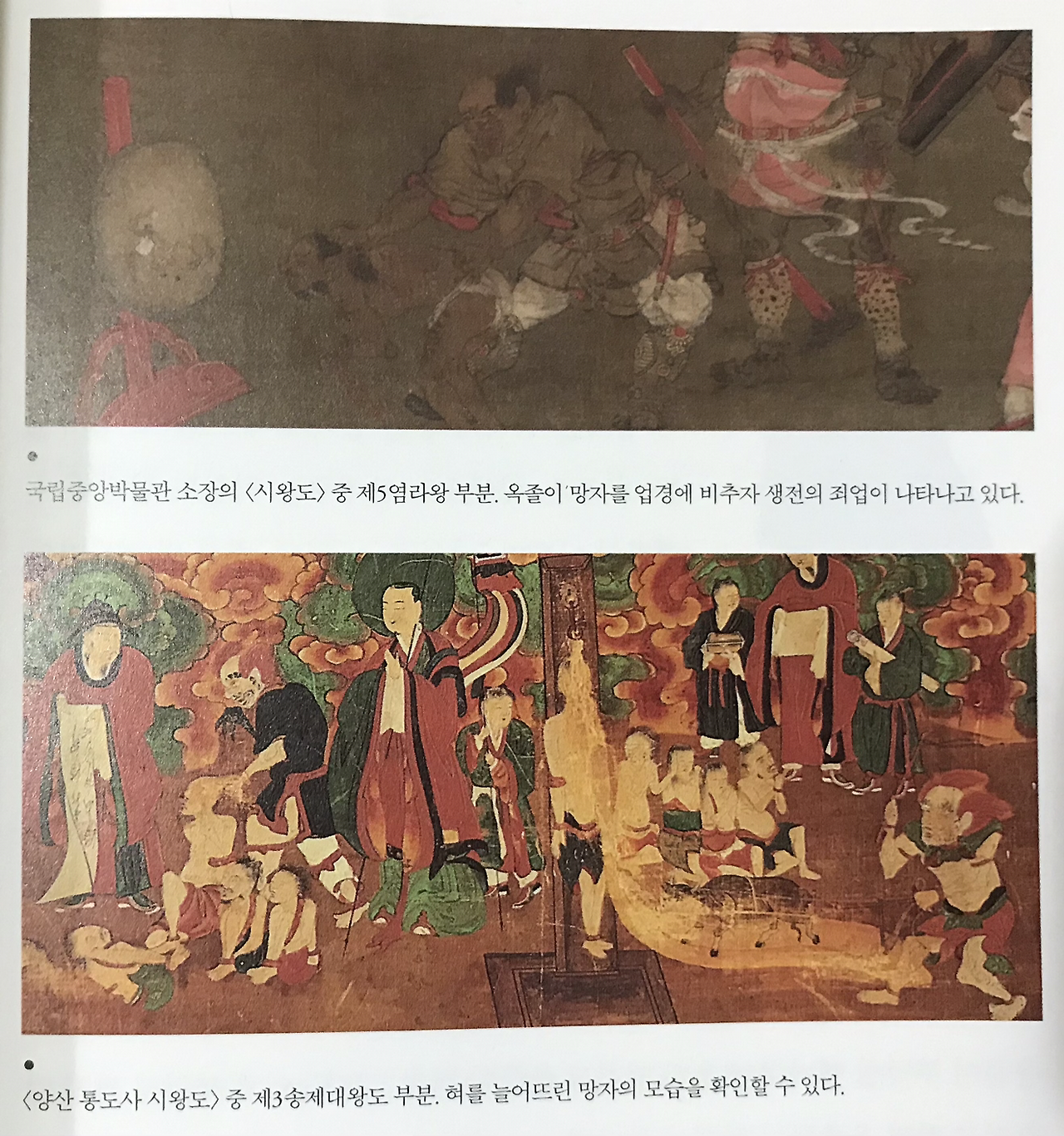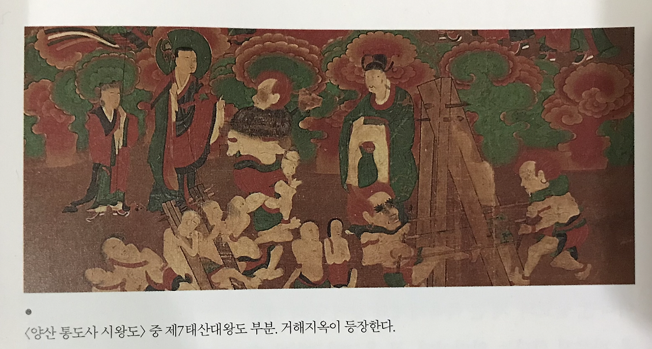 불교의 '시왕'은 열 명의 사후 심판관인 '십왕(十王)'이다. 이 중 제일은 염라대왕(閻羅大王)인데 인도 고대신화에서 제일 처음 죽음을 경험한 신 '야마(Yama)'라는 산스크리트 이름을 음역한 '염마' 또는 '염라'가 그 유래란다. 염라대왕은 이 열 명의 심판관 중 중앙인 다섯 번째 관문을 관장하는데 '49재'의 단계로 치면 죽은지 5주째가 된다. [금강경]을 면류관처럼 쓴 염라는 사자의 생을 비추는 업경을 비추며 지난 삶을 반성하게 한단다. 거짓으로 변명하는 자는 옥졸로 하여금 몽둥이 찜질을 가하게 하고 혀를 길게 늘여 소쟁기로 갈아엎는 '발설' 또는 '경설' 지옥을 운영한다. 생전에 거짓과 이간질을 일삼던 자들이 염라대왕의 주요 심판대상이다.