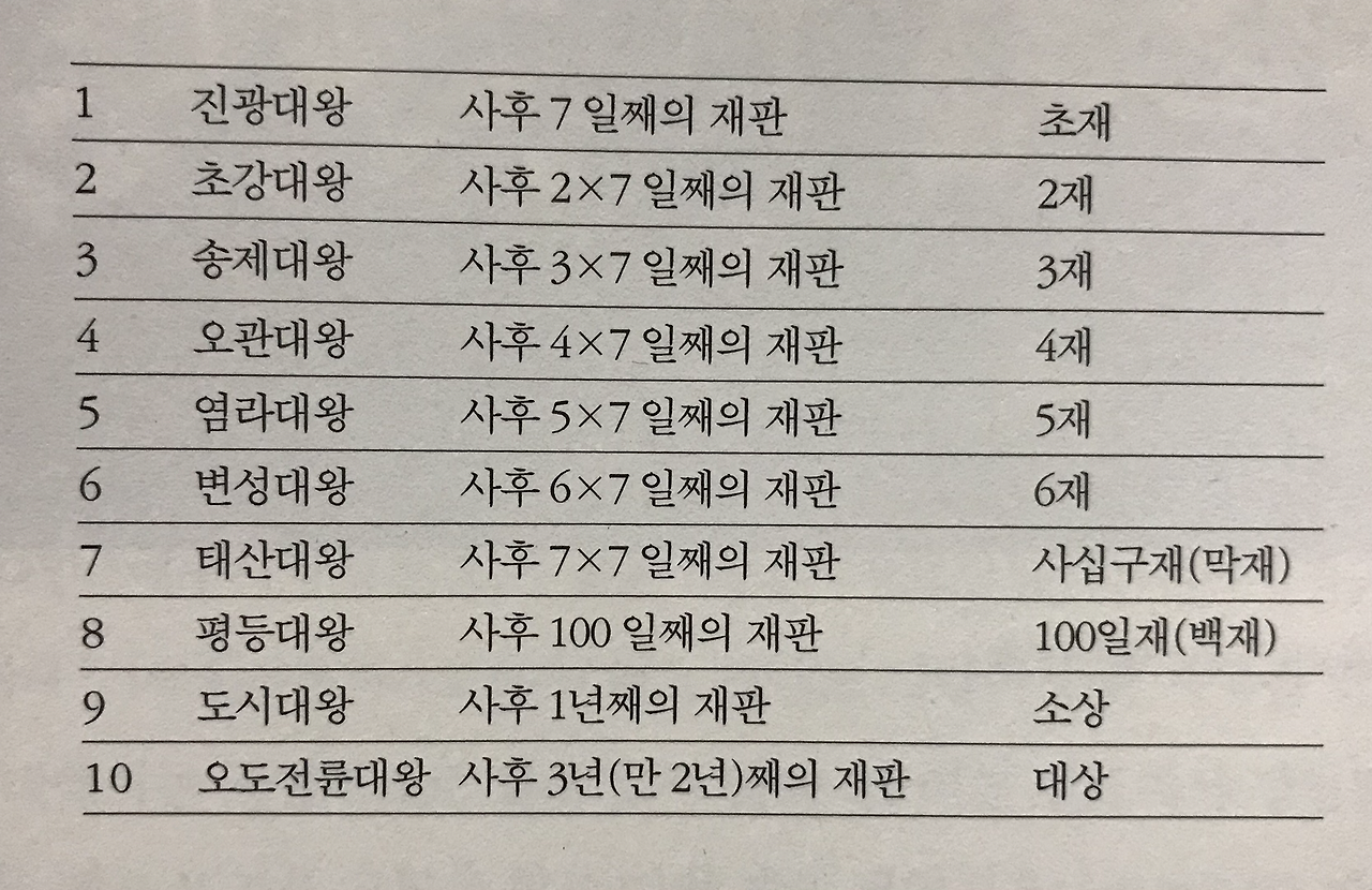 사후 7주째가 되는 '49재'를 주관하는 시왕은 '태산대왕(泰山大王)'이다. 중국 도교의 영향으로 신선 중 으뜸인 '태산부군'이 일곱 번째 지옥을 관장한다. 여기서 비로소 망자는 윤회의 길을 선택하는데 각자 살아온 업에 따라 지옥, 아귀, 축생, 아수라, 인간, 천상의 문을 열게 된단다. 이 49일간 유족들이 정성을 다해 재계를 하면 망자가 생전 쌓은 업에도 불구하고 좋은 문을 선택할 수도 있다고 한다.
