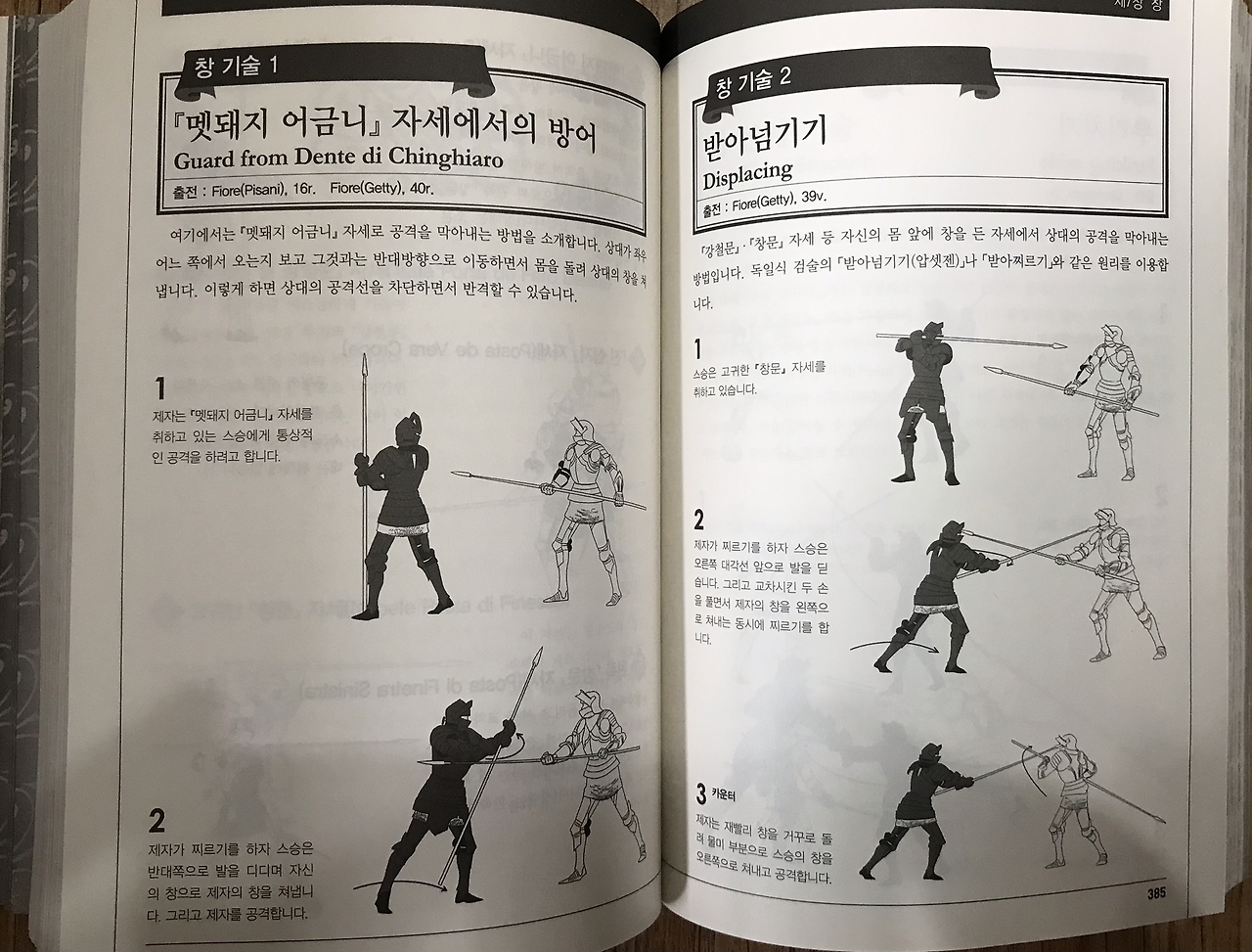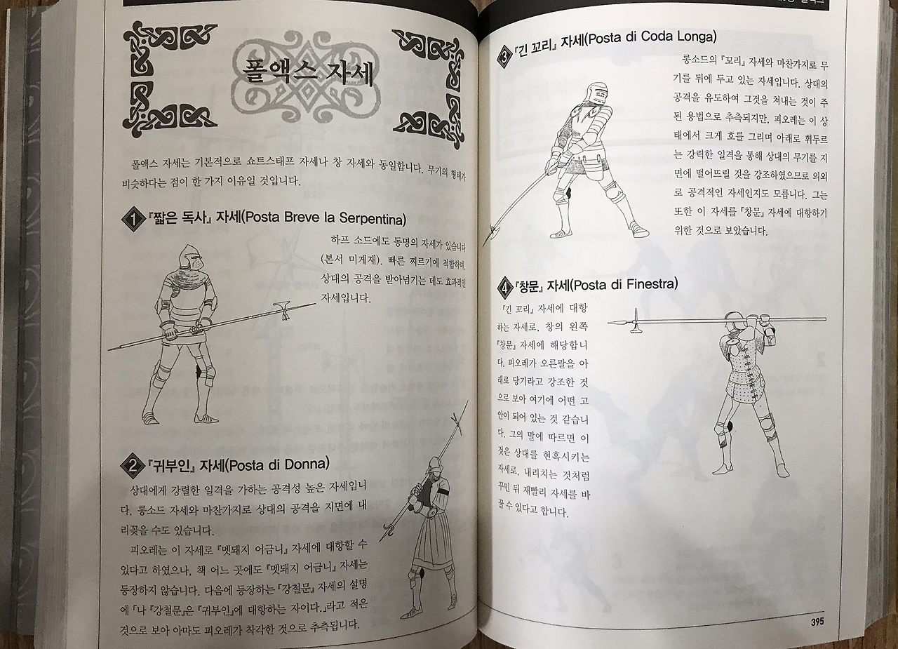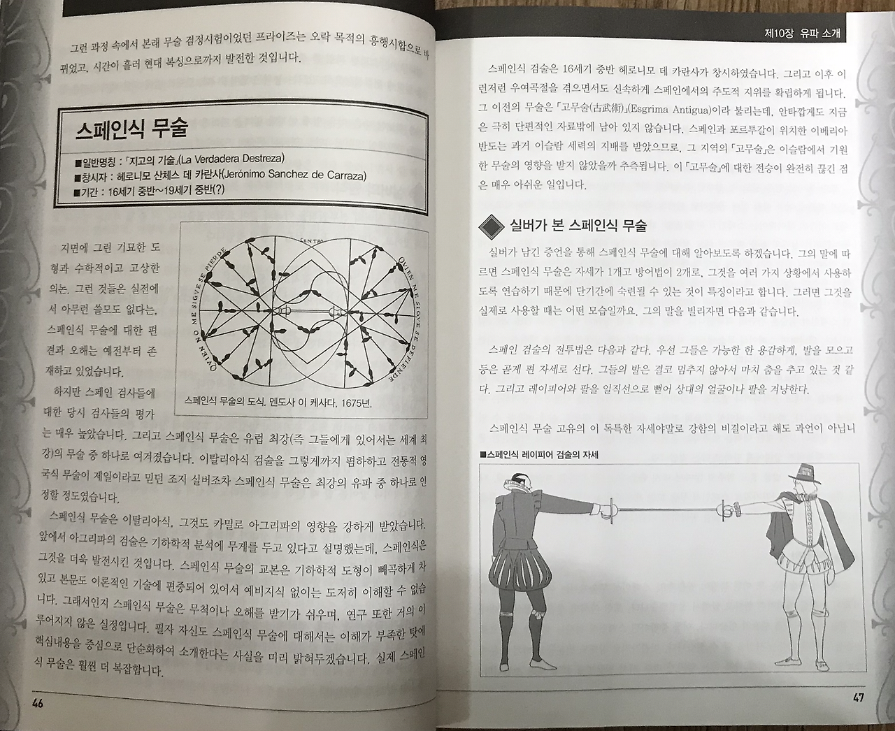 저자는 중세에서 르네상스 전까지 유럽의 독일식, 이탈리아와 스페인식 유파를 소개하고 장검(롱소드)과 단검(대거) 및 쌍검(몬탄테), 스틱과 창, 도끼(폴엑스) 등의 무기술과 맨손 레슬링에 관한 잡학 지식을 풀어놓는다.