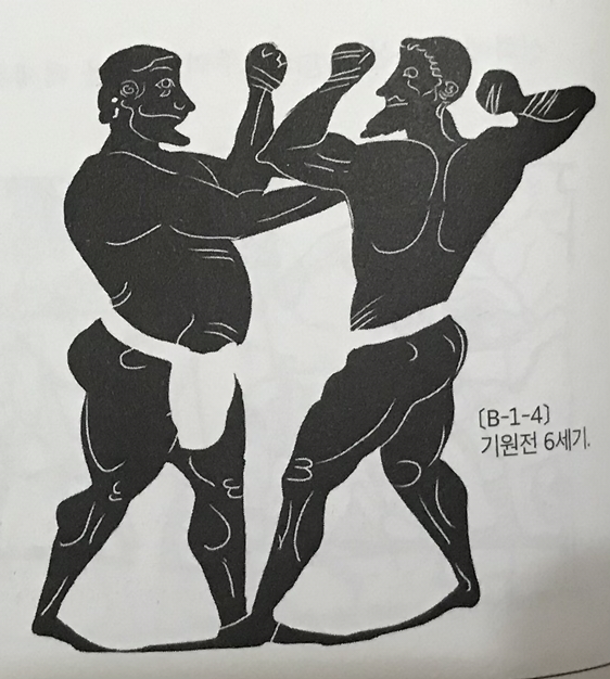 "(고대 그리스) 신화에서 복싱(Pygne:주먹)은 영웅 테세우스가 발명한 것으로 서술된다... 복싱에 관한 가장 오래된 기록은 호메로스의 [일리아드]인데, 작중에 활약하는 영웅이 스스로 '전투는 뒤떨어지지만 주먹으로 살을 찢고 뼈를 부수기로는 누구에게도 지지 않는다'고 선언한 바와 같이 당시 복싱 기술은 전장에서 도움이 되지 않는다고 여겼던 듯 하다... (당시 복싱은) 주먹을 이용한 타격만으로 승부를 가리는 만큼 당시 가장 위험한 스포츠로 인식되었으며, 올림픽 대회에서도 두 명의 사망이 확인되고 있다. 초기 복싱에는 규칙이라 할 만한 것이 거의 없었고, 처음으로 공식적인 규칙이 확립된 것은 기원전 688년의 일이다."