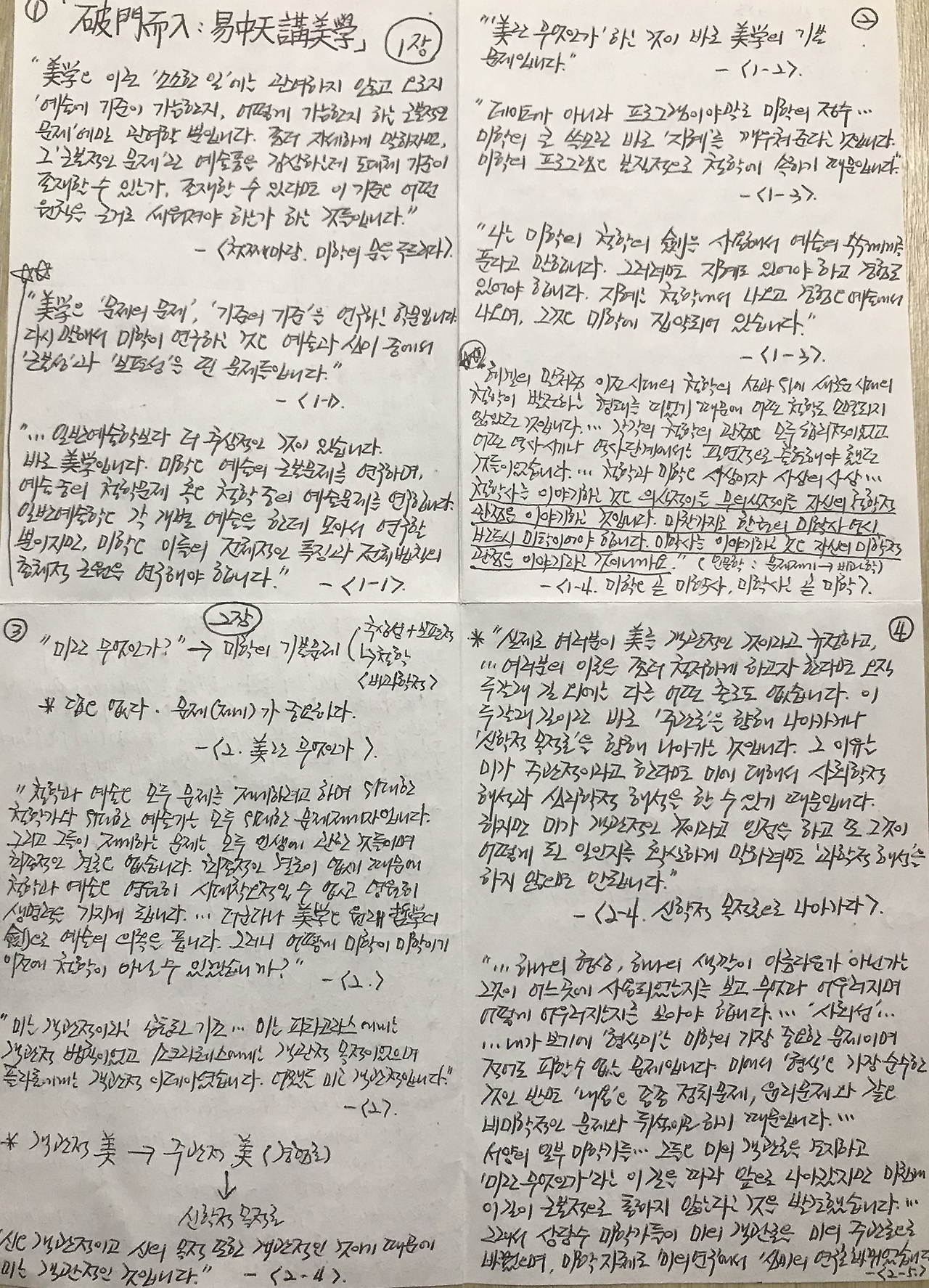 "... 세계는 절대이념의 자아실현 과정이 아니라 인류가 자신의 '실천'을 통해서 자아를 창조하고 실현하는 과정입니다. '실천'은 마르크스주의의 과학적 세계관의 핵심입니다... 마르크스는 새로운 유물론의 발판은 인간사회 혹은 사회화된 인간이고, 인간의 본질은 결코 개인의 고유한 추상물이 아니며 그 현실성 위에서 모든 사회관계의 총화라고 선포했습니다... 예술철학만 이야기하고 일반예술학은 이야기하지 않는다면 '실재'적인 이야기를 계속해 나갈 수가 없습니다."