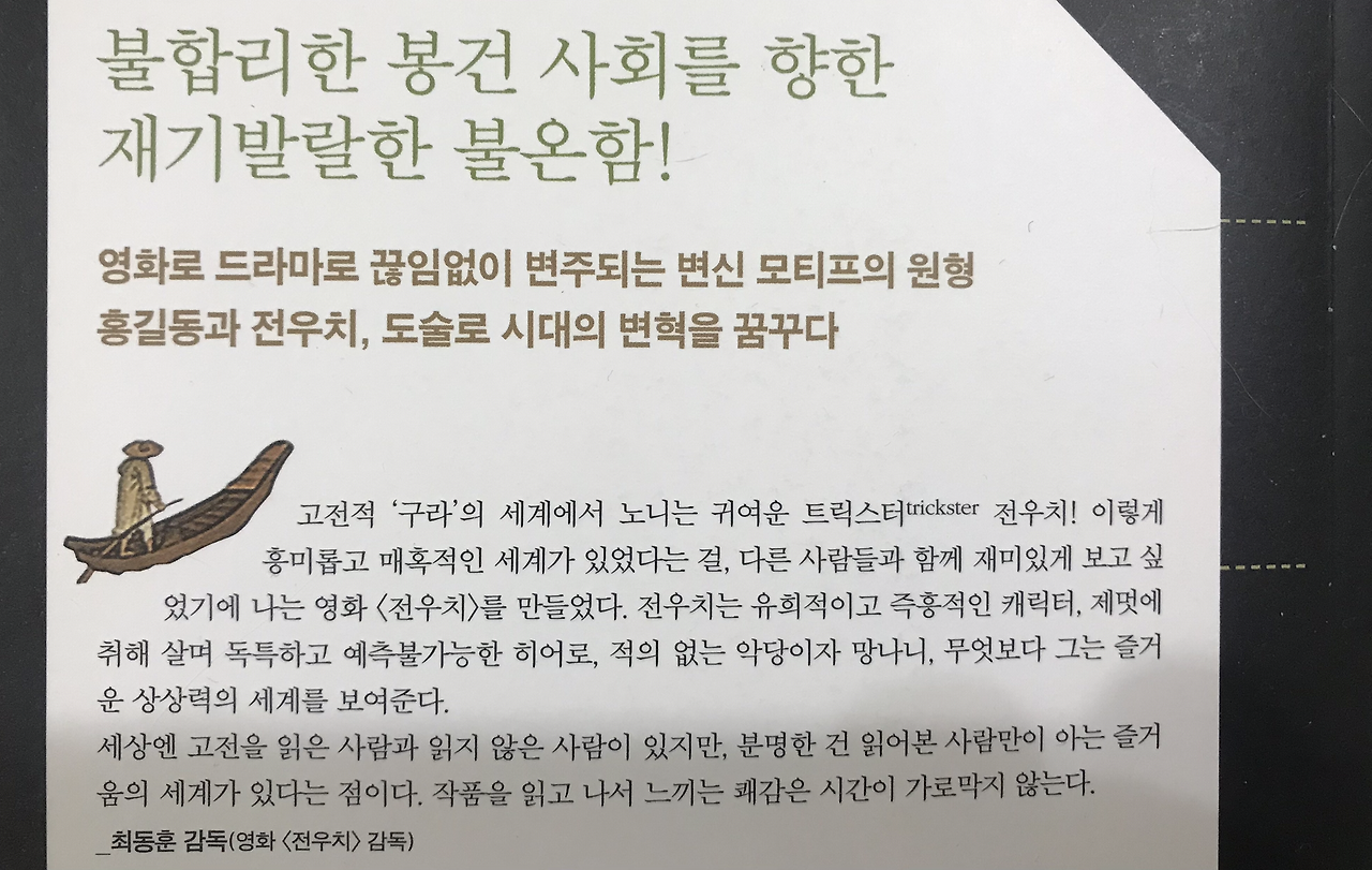 한편, 아마도 [홍길동전]에 영향을 받아 창작되고 구전되었을 [전우치전]은 어쩌면 최초에는 현실적인 [홍길동전]을 비꼬는 일종의 '반(反)홍길동전'이 아니었을까 나는 추측한다.