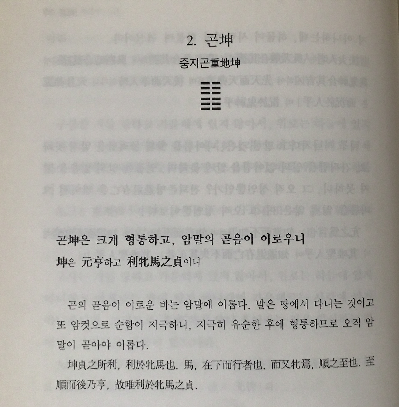 이로써 여섯개의 '양효(-)'로만 구성된 '중천건(重天乾)' 괘는 '음효(--)'로만 여섯효가 이루진 '중지곤(重地坤)' 괘로 넘어간다.