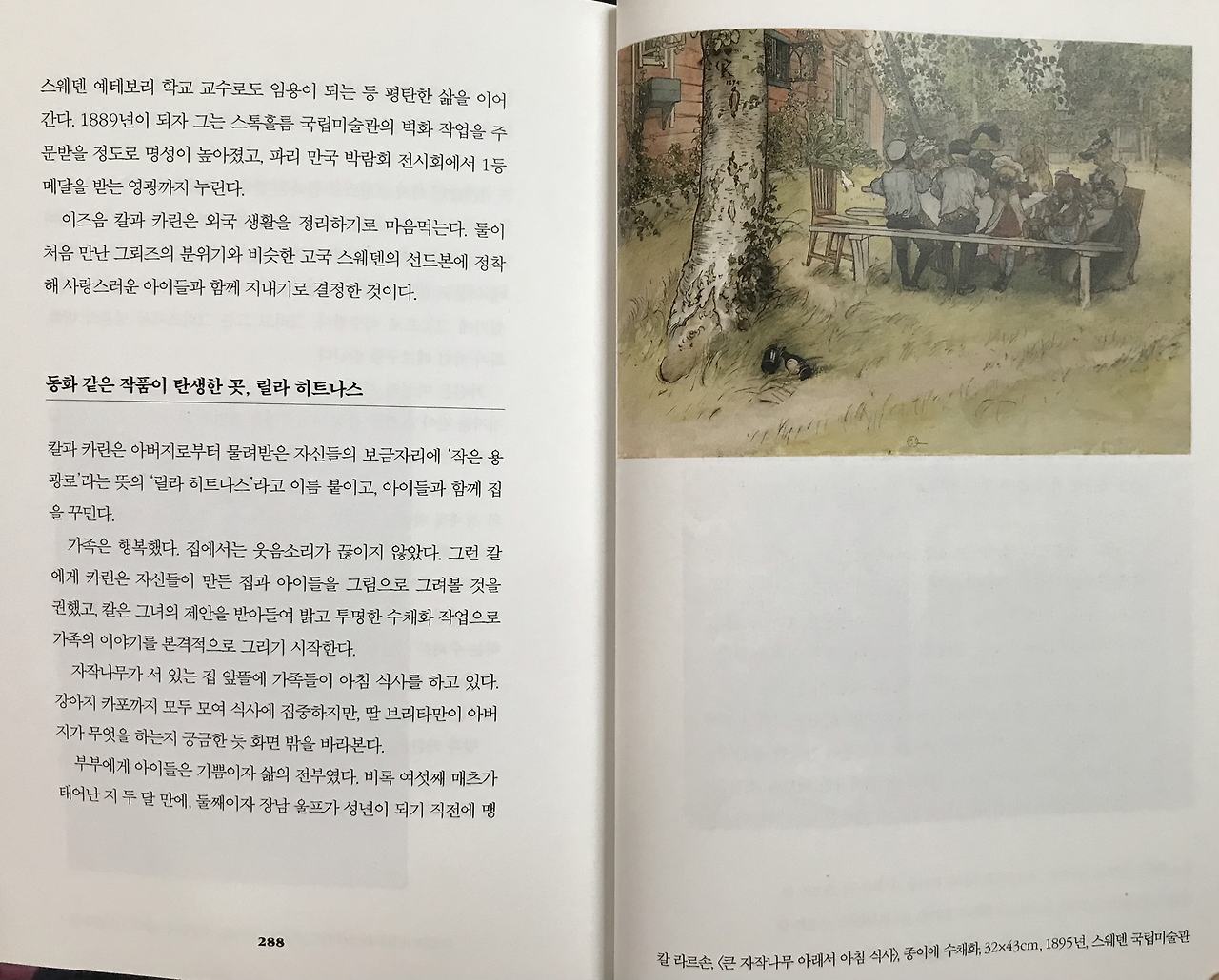 그런 반면 칼 라르손의 그림들은 우리 일상의 접시와 찻잔에 어울리는 풍경이다.