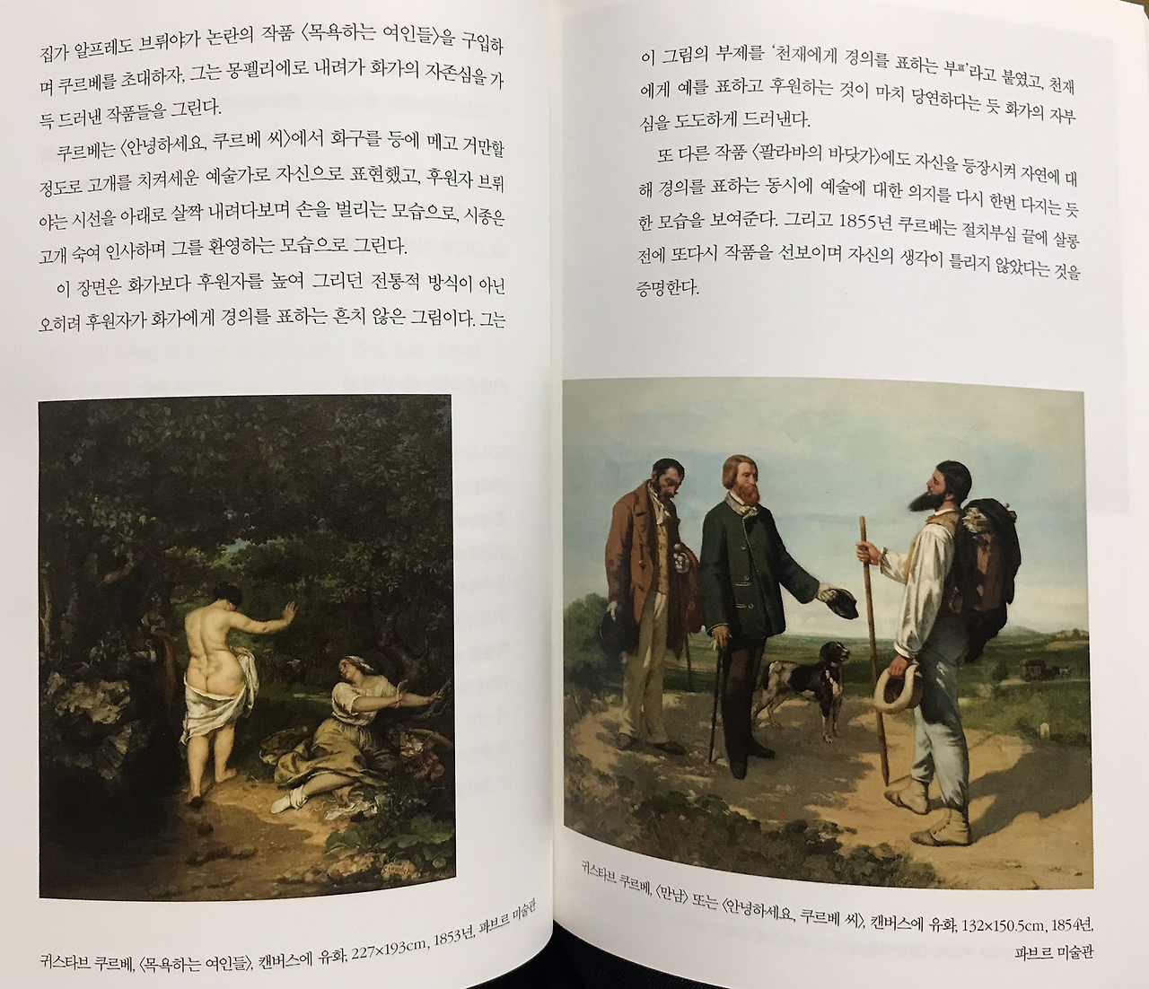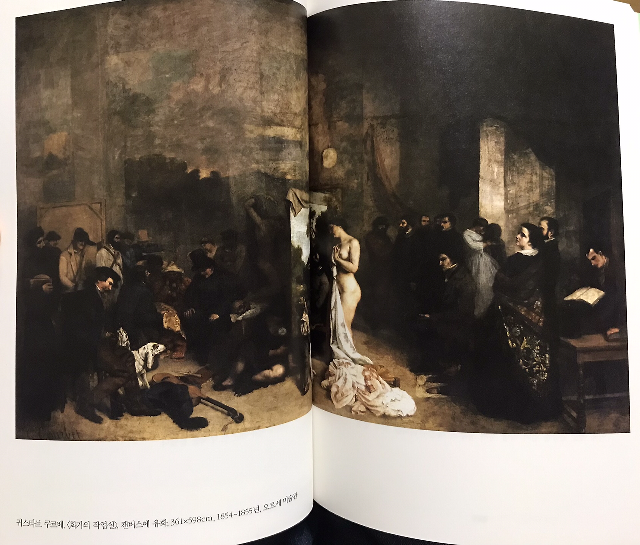19세기 '사실주의'의 대표 화가 귀스타브 쿠르베 역시 당시 신고전주의와 낭만주의가 대세였던 아카데미즘에 저항한 화가다. 실제하지 않는 천사를 데려오면 '사실'대로 그려주겠다고 장담한 쿠르베는 자신만만한 예술가였다. 여인의 나체를 그리스 신화처럼 미화하지 않고 너무 적나라하게 그렸다는 비판에 굴하지 않았고 후원자에게 간택받는 것이 아니라 화가 본인이 후원자를 선택했으며 결국 만국박람회장 맞은편 임시 건물에서 '사실주의 관'이라는 본인 개인전을 열면서 이후 젊은 후배 화가들에게 예술가적 자존심의 본보기가 되었다. 쿠르베의 이 '사실주의 관'에는 당대의 낭만주의 거장 외젠 들라크루아가 한 시간 동안 관람했다는데, 신화와 역사화를 강조한 아카데미즘에 맞지 않게 사소한 개인적 소재를 크게도 그렸다고 살롱전에서 거부당한 쿠르베의 [화가의 작업실](1854~1855)을 들라크루아가 특히 극찬했다고 한다.
