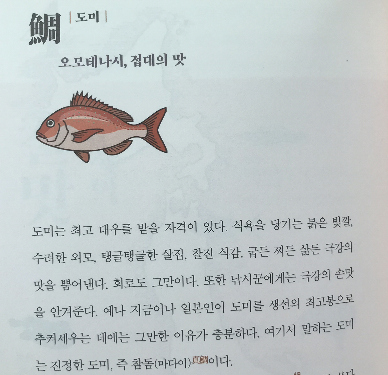 접대(오모테나시)를 비롯하여 물고기 중 최고는 도미(鯛/조)다. 사시미, 찜, 조림 등 어떤 음식으로도 중요한 접대의 앞자리를 차지한다. 우리는 회로 많이 먹는데, 줄돔, 가시돔 같은 건 이름만 따온 거고 진짜 도미는 '참돔'이다. 임진왜란 이후 첫 조선통신사가 건너갔을 때도 에도 막부는 도미를 차렸고 우리 젊을 때만 해도 결혼식이나 돌잔치의 뷔페상에는 도미가 통째로 누워 있었다. 우리의 붕어빵은 본래 일본의 도미빵이었고, 사시미나 회로 유명한 도미의 손질은 과연 사무라이 무사의 칼맛도 난다.