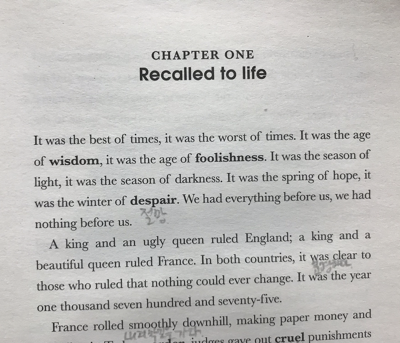 한 시대를 짧으면서도 인상깊게 대비되는 문장으로 묘사한 대목이 압권이다. 번역하기에 따라 "최고의 시간이자, 최악의 시간이었다"는 식의 병렬식 문장도 좋고, "최고의 시간이었지만(한편으로는), 최악의 시간이었다"는 식의 대비식 문장도 나쁘지 않다. 아마도 번역자에게는 두 가지 표현 중 무엇으로 할까 고민되는 첫 문장이기도 하겠으나, 원문은 단순한 한 줄 문장들의 나열이다.