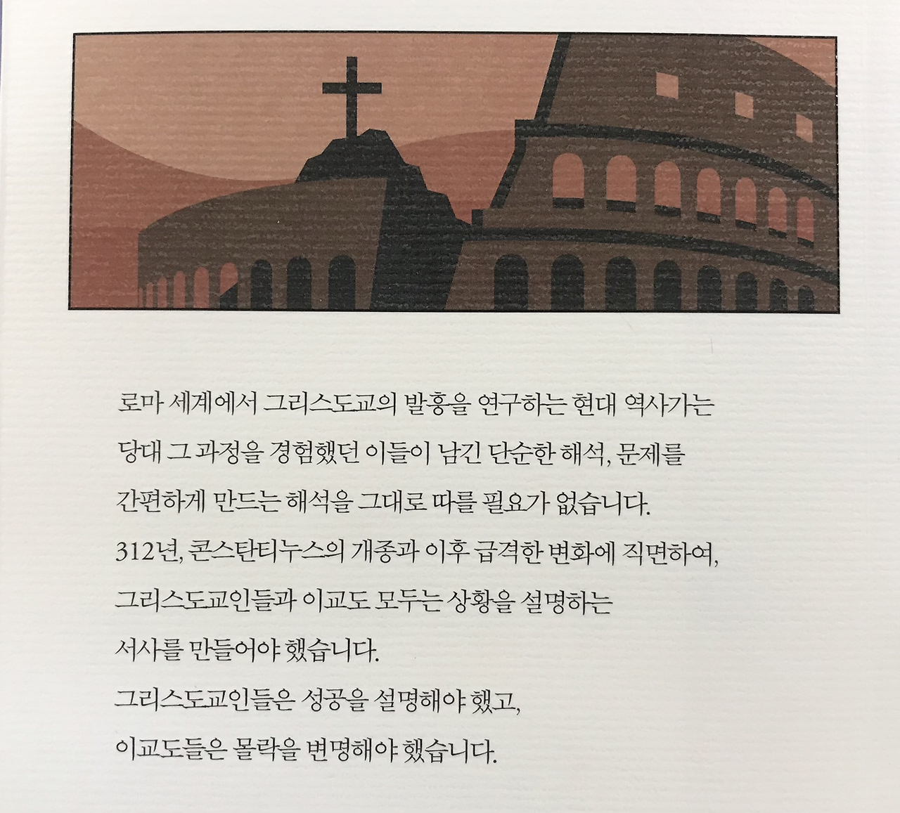 "... 그들 대부분은 자신들이 '고대 후기'라는 시대 속에 살고 있다는 사실조차 인지하지 못했을 것입니다. 그 시대가 끝날 무렵에는 대부분 자신을 그리스도교인이라 여겼지만, 자신들의 후예들처럼 현재의 자신과 과거(이교 세계)의 경계를 명확하게 긋지는 않았습니다. 그들은 모호한 현재 안에서 최선을 다해 살아가는 것에 만족했습니다."