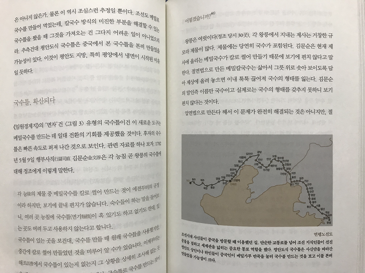 "... 18세기 후반 국수가 팔리고 있었고 서울 시정에 국수를 파는 가게가 등장... 서울만이 아니다. 평안도의 경우 유득공의 <서경잡설>에 '냉면'이 팔리는 정황이 담겨 있어, 이 작품이 지어진 1773년에 이미 '냉면'이 상업화되어 있었음을 짐작하게 한다."
